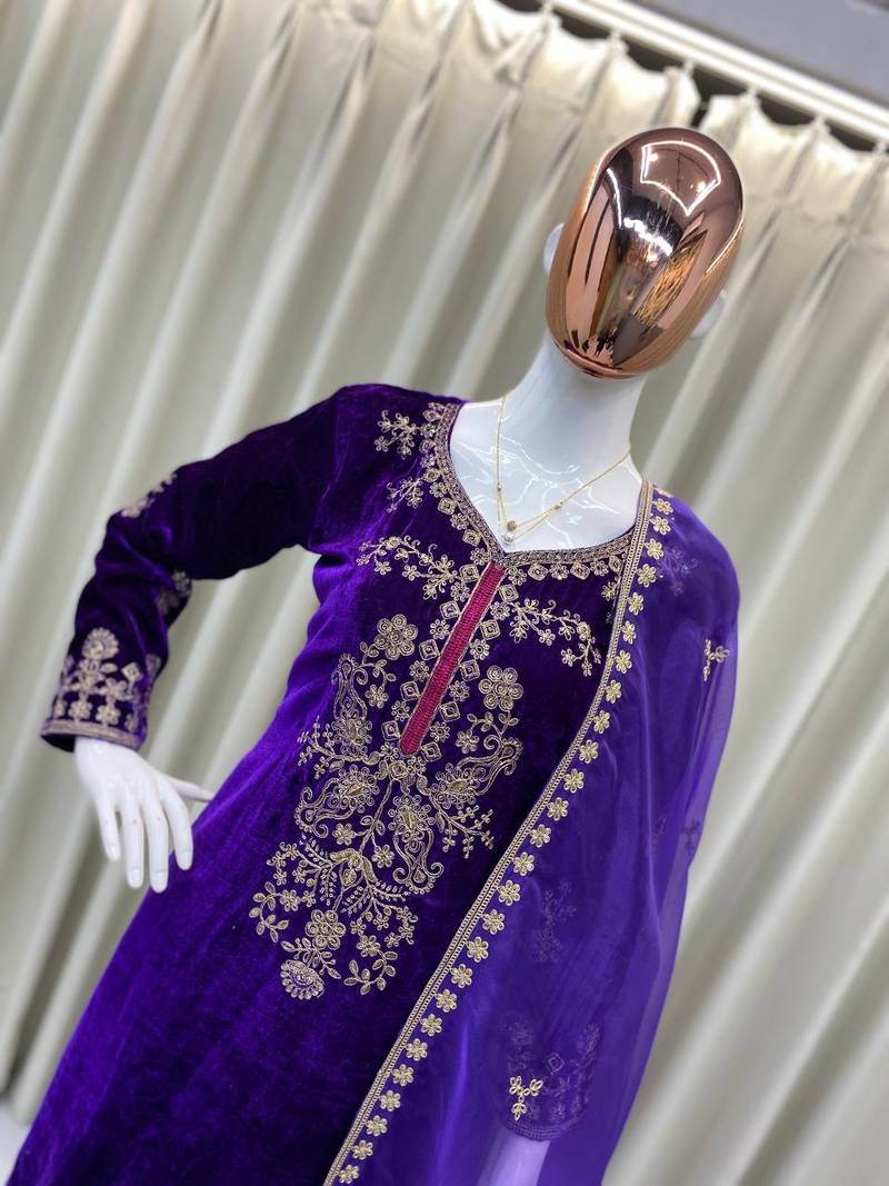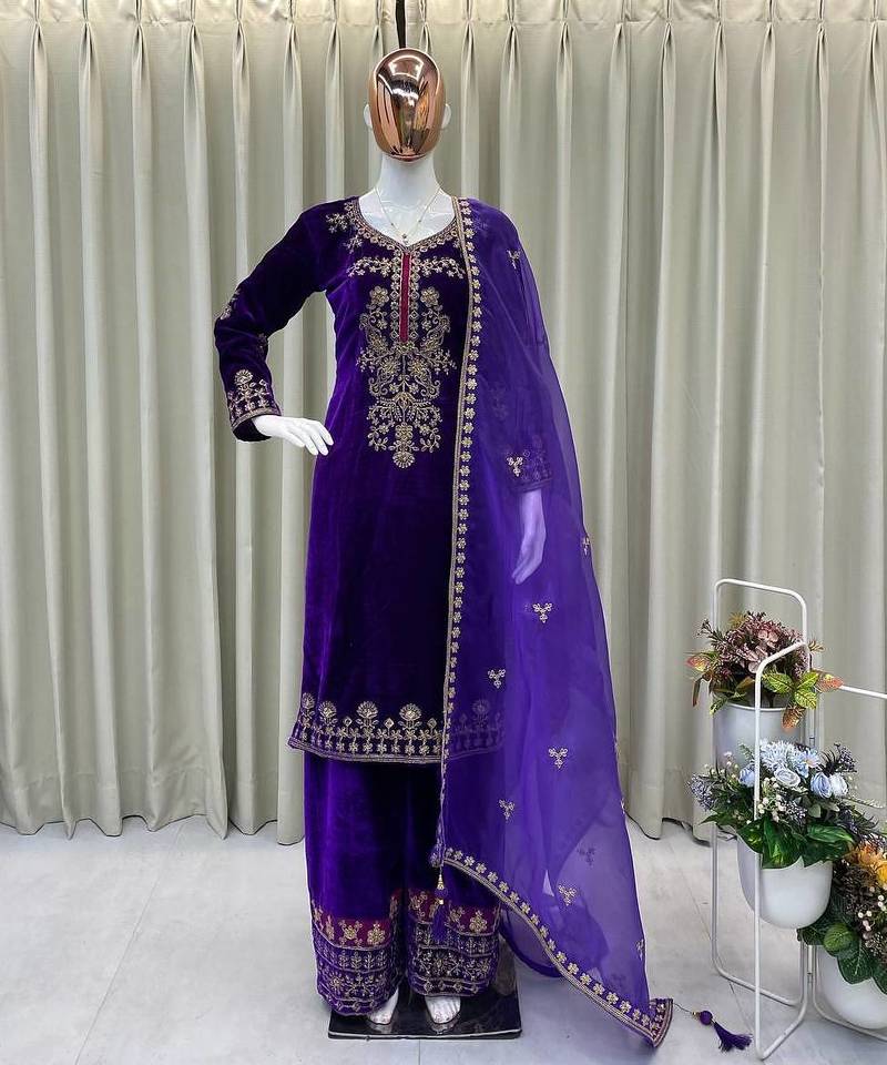 | Product Name | Purple Velvet Cording Sequence Embroidery Work Suit & Palazzo With Dupatta Set | |