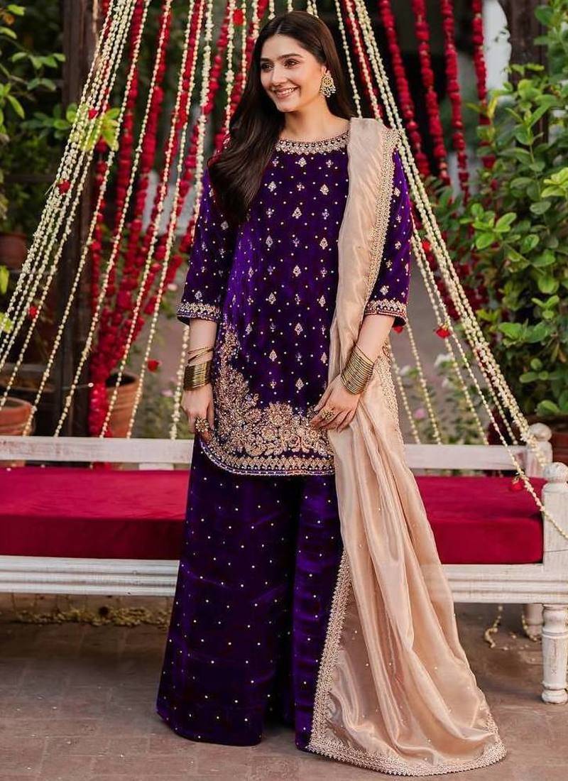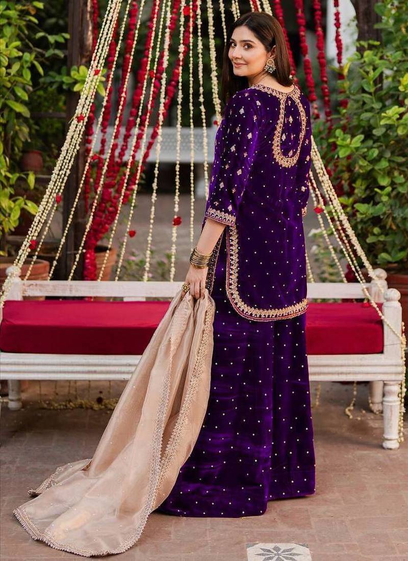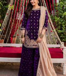| Product Name | Purple Viscose Velvet Intricate Thread & Sequence With Peral Work Top Plazzo With Dupatta | |
