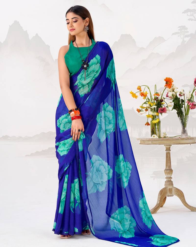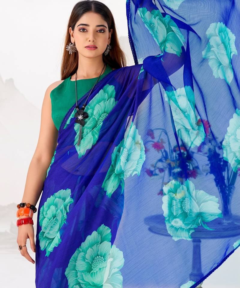 Royal blue floral print with lace border work chiffon saree & unstitched blouse