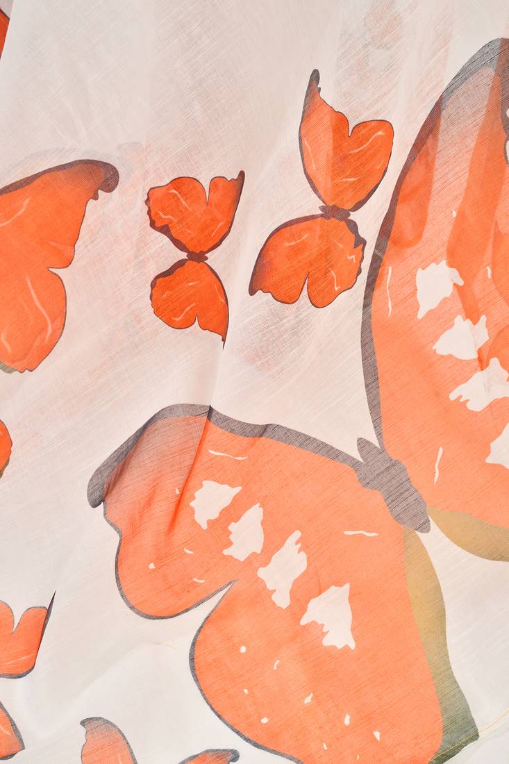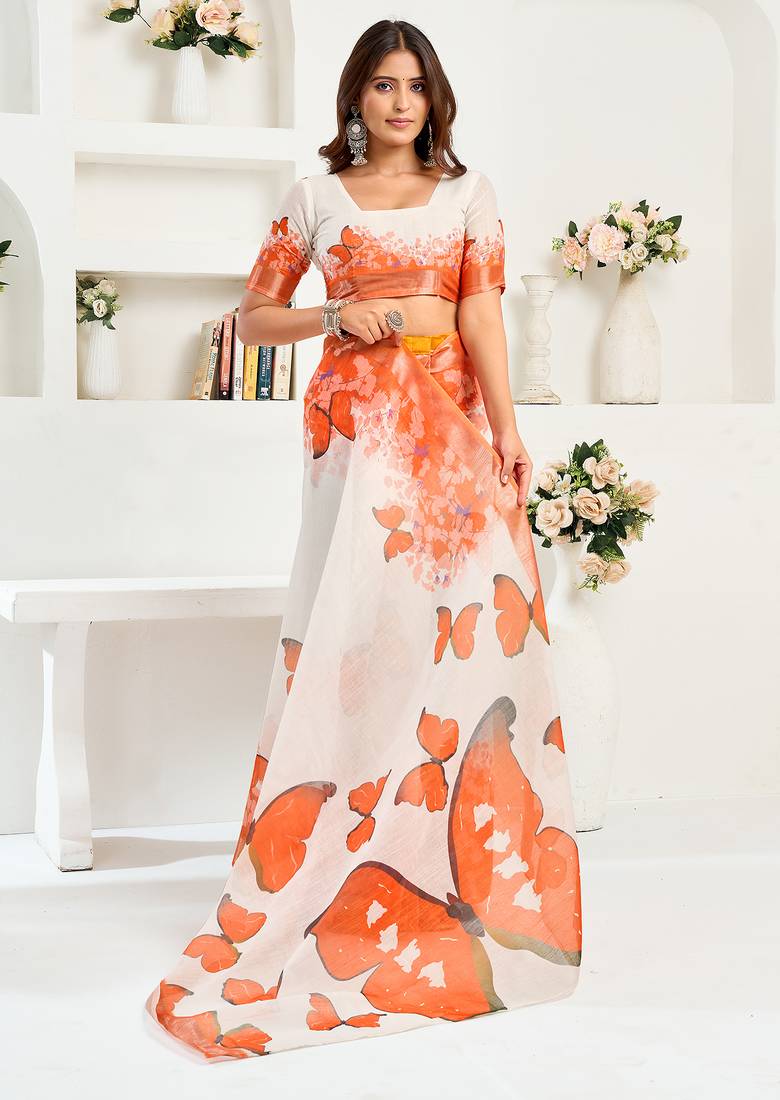 | Product Name | White Orange Digital Printed Linen Ready To Wear Designer Saree With Unstitched Blouse | |