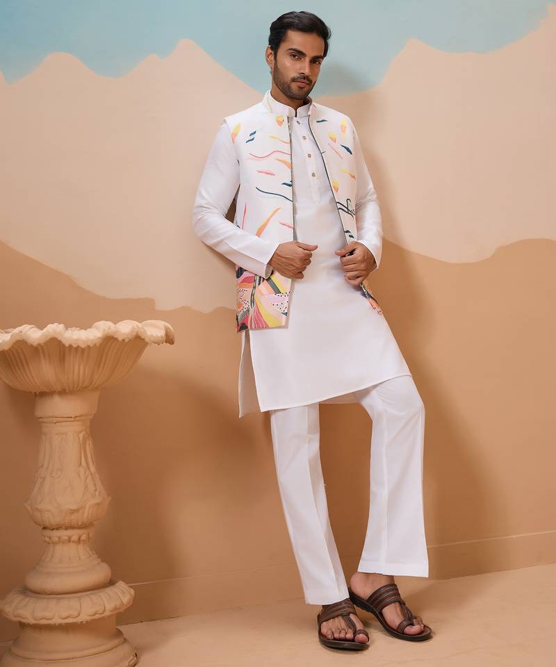 | Product Name | White Silk Multi Thread With Embroidered Work Kurta Jacket & Bottom | |