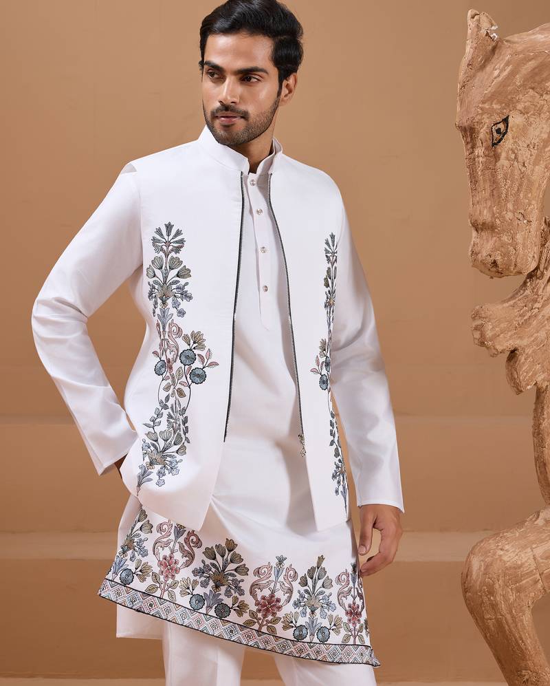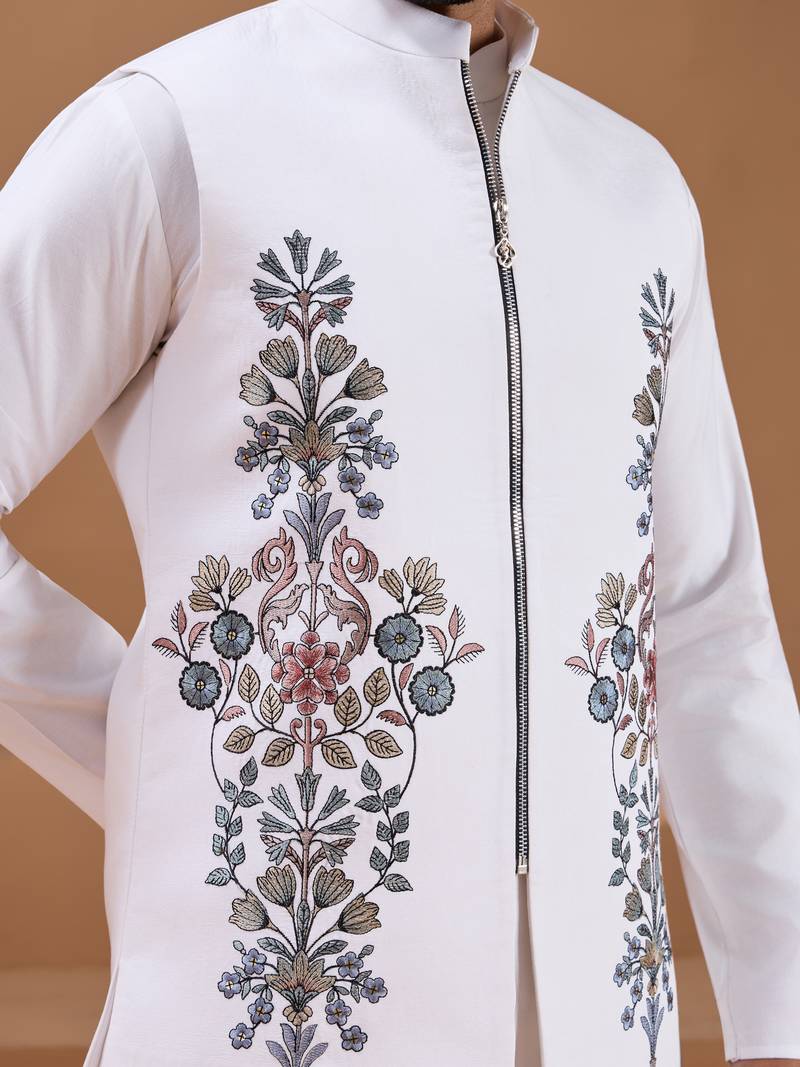 | Product Name | White Viscose Silk Multi Thread With Sequence Embroidered Work Kurta Jacket & Bottom | |