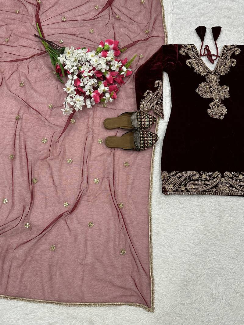 Wine viscose velvet cording sequence embroidery work suit-bottom with dupatta stitched
