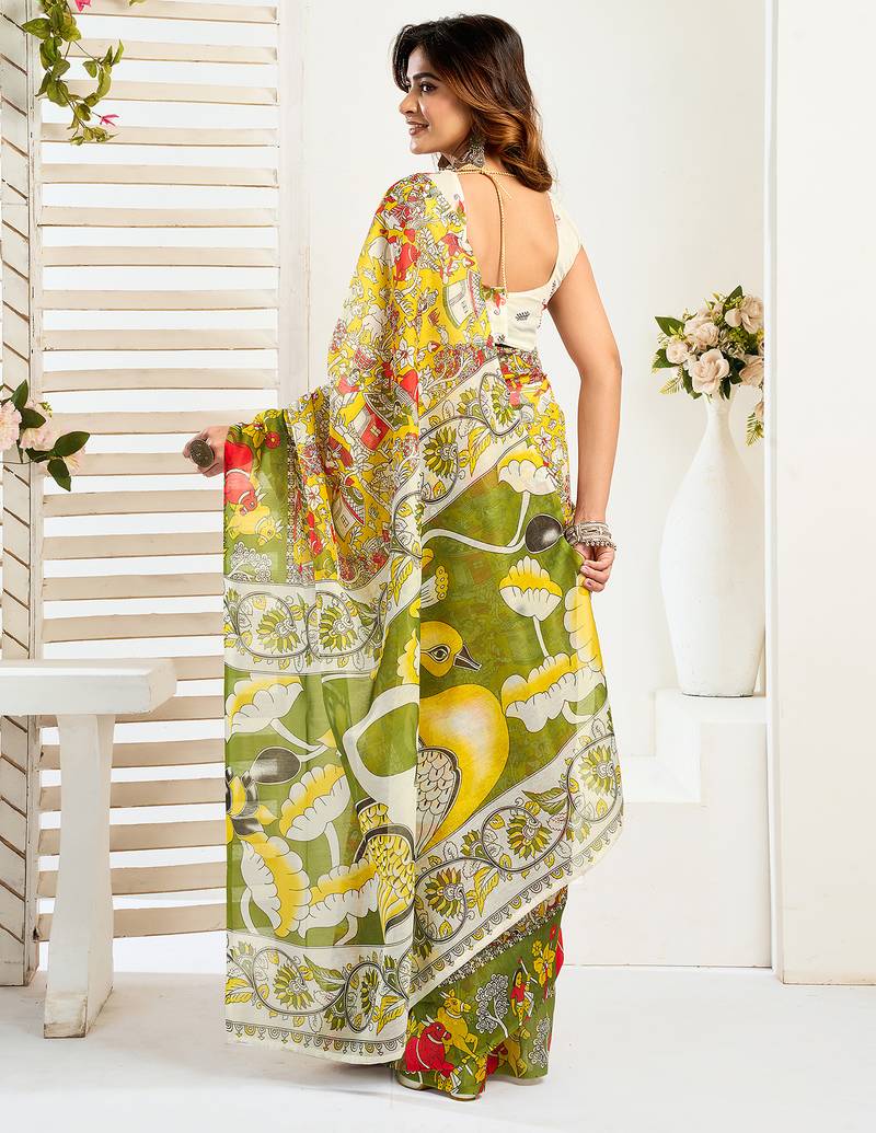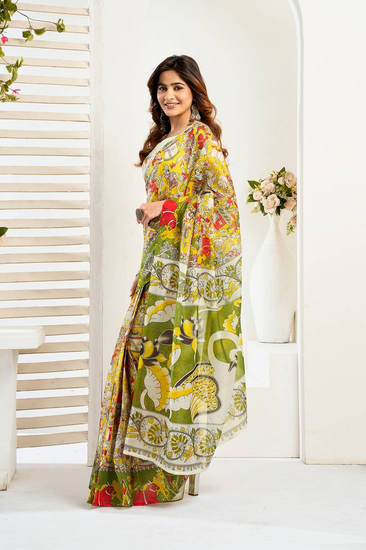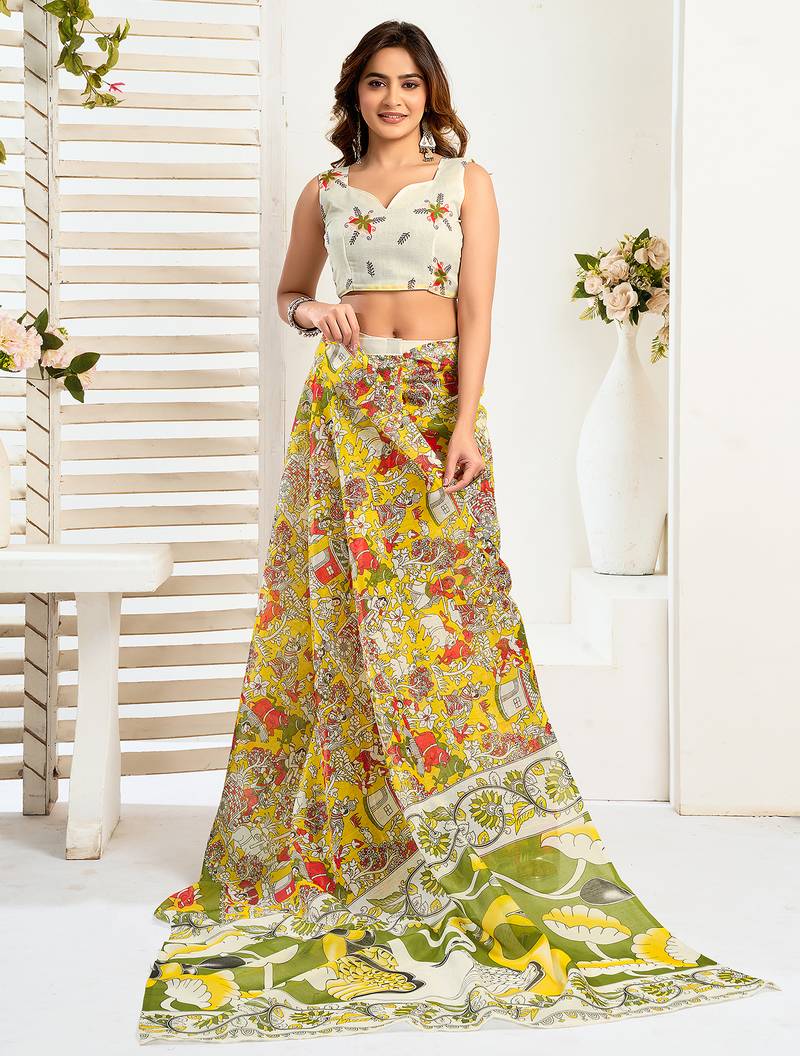 Product Name Yellow Digital Printed Linen Ready To Wear Designer Saree With Unstitched Blouse