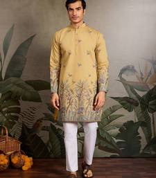 Yellow viscose silk thread with sequence embroidered work kurta only