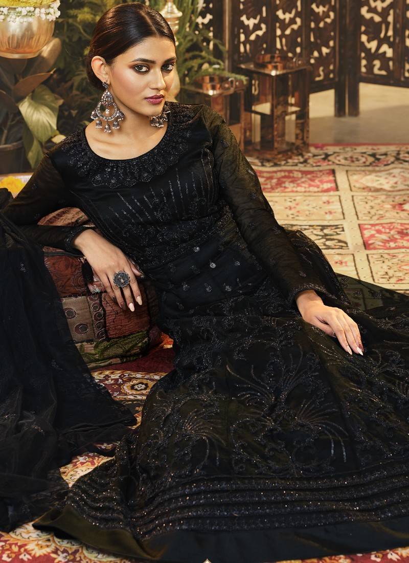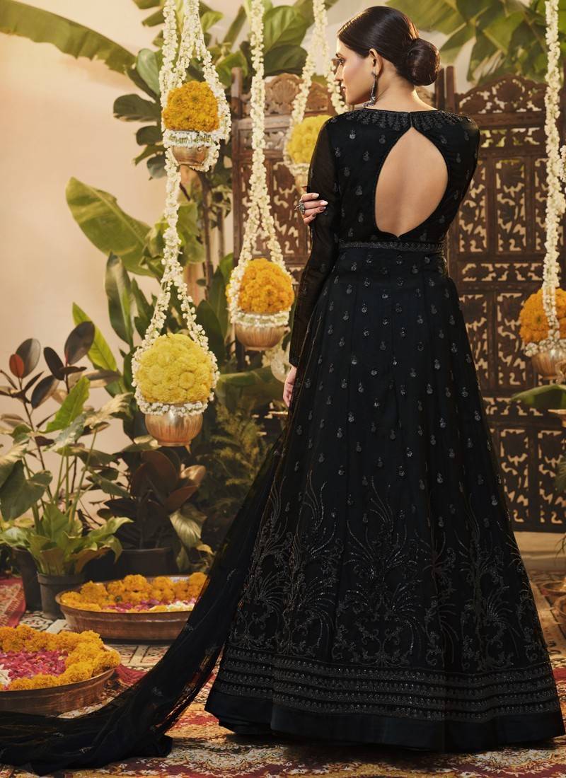 Black embroidered wedding anarkali suit semi stitched