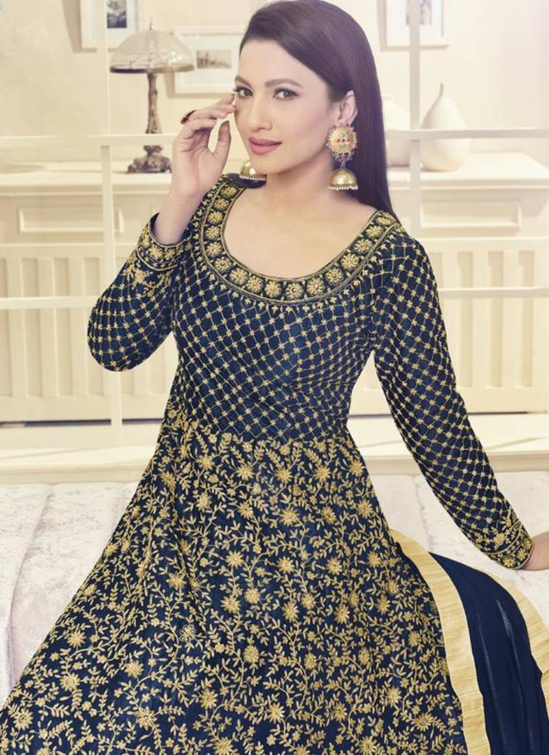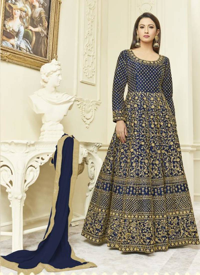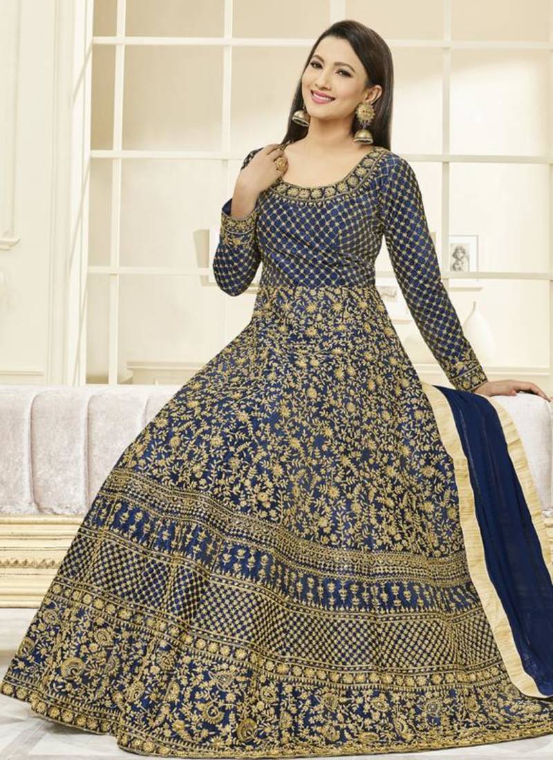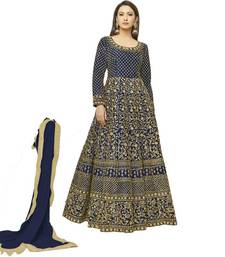 Full Embroidered Designer Suit In Here In Navy Blue Color Paired With Navy Blue Colored Bottom And Dupatta. Its Top Is Fabricated On Art Silk Paired With Santoon Bottom And Chiffon Dupatta. It Has Eavy Embroidery All Over The Top. Buy Now.