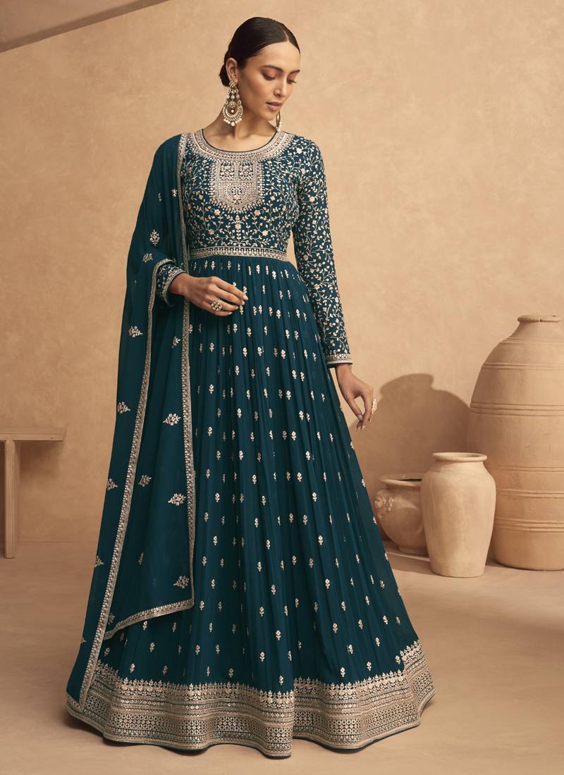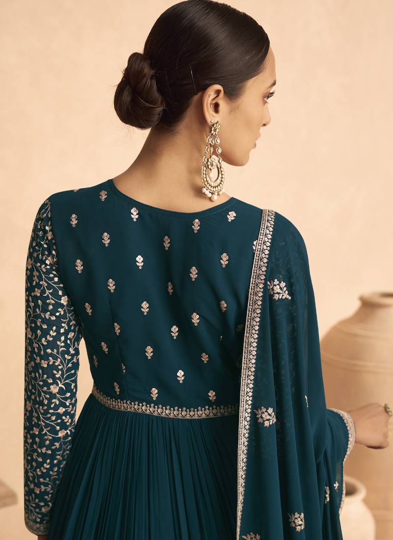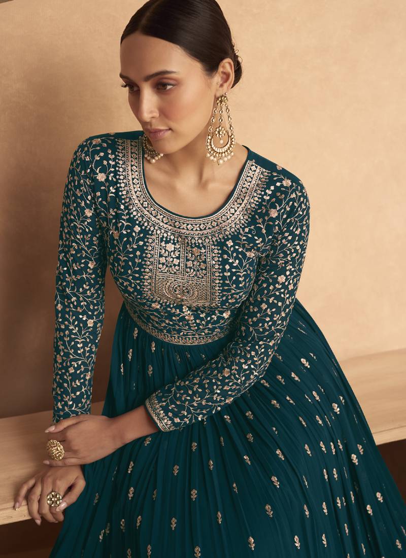Turquoise sequence embroidery festive anarkali suit semi stitched