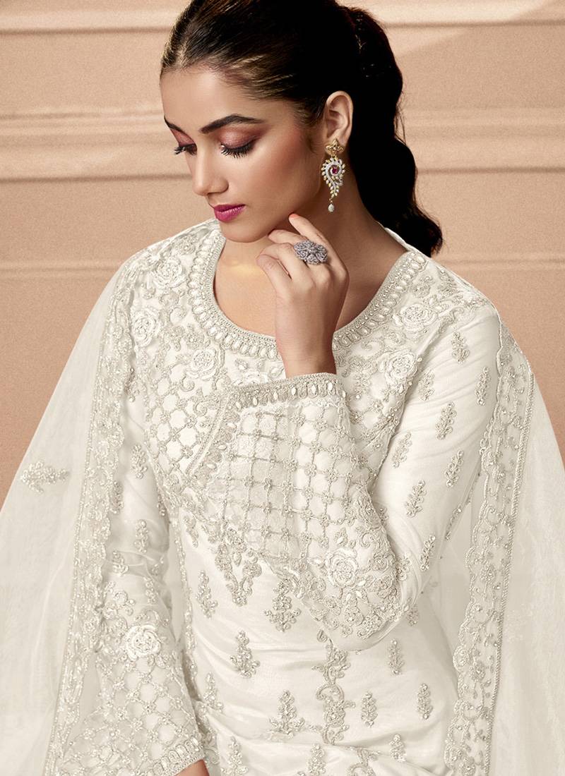 | Product Description | White Embroidery Pakistani Pant Style Suit Is What Fashionable Women Would Love To Flaunt. Showcasing A Beautiful Top Enticing Cording Zari, Resham Thread And Crystal Stone Work Embroidery On Soft Net Fabric That Has Beautiful Traditional Details Paired With Satin Flared Pants Bottom With Embellished Hem Line And Inner. The Beauty Part Is Its Butti And Border Embellished Soft Net Dupatta. Team It Up With Statement Jewellery And Fancy Clutch To Look Mesmerising On This Wedding Season. |