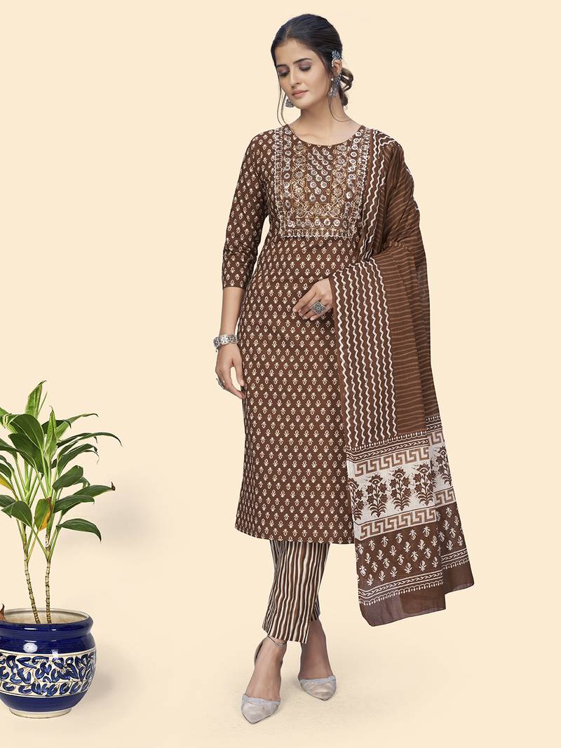 | Product Name | Vbuyz Women's Print & Embroidered Straight Cotton Brown Stitched Kurta Pant With Dupatta | |