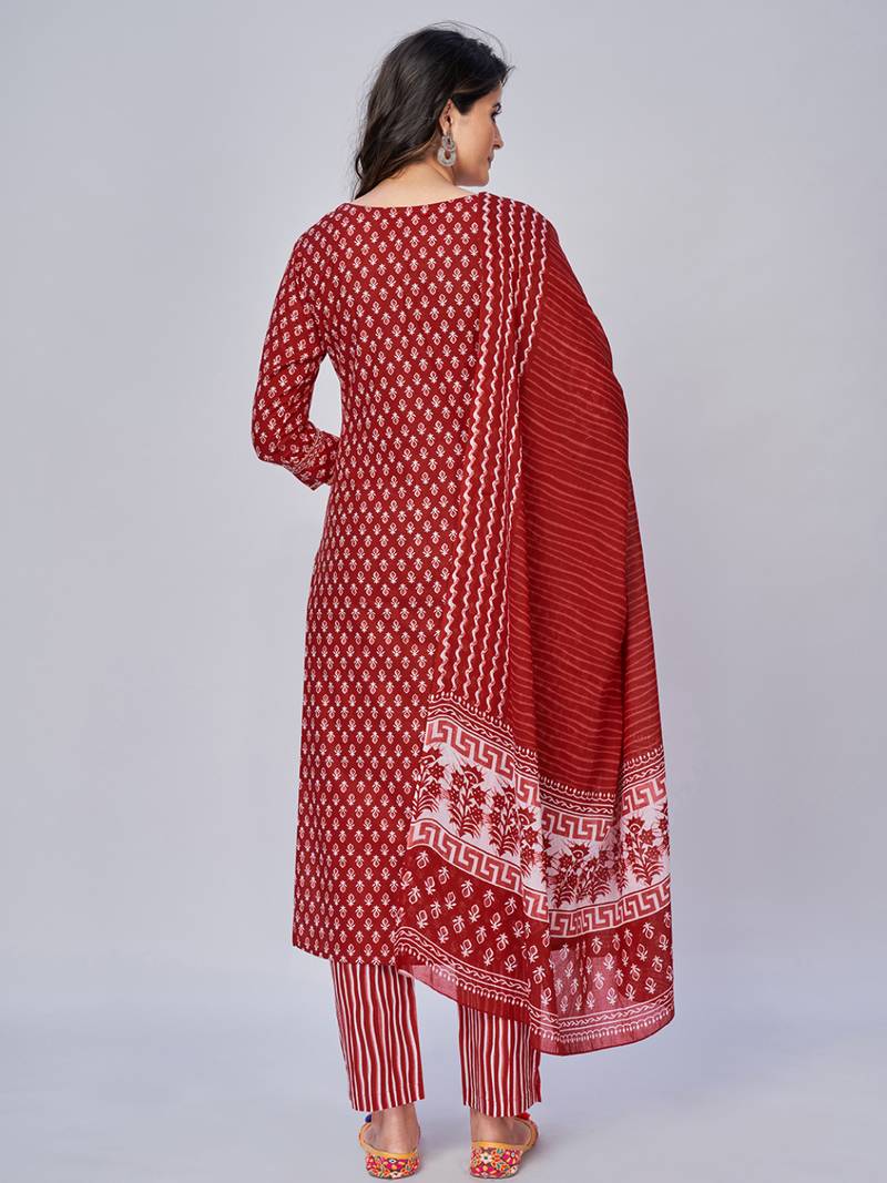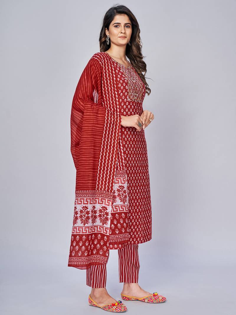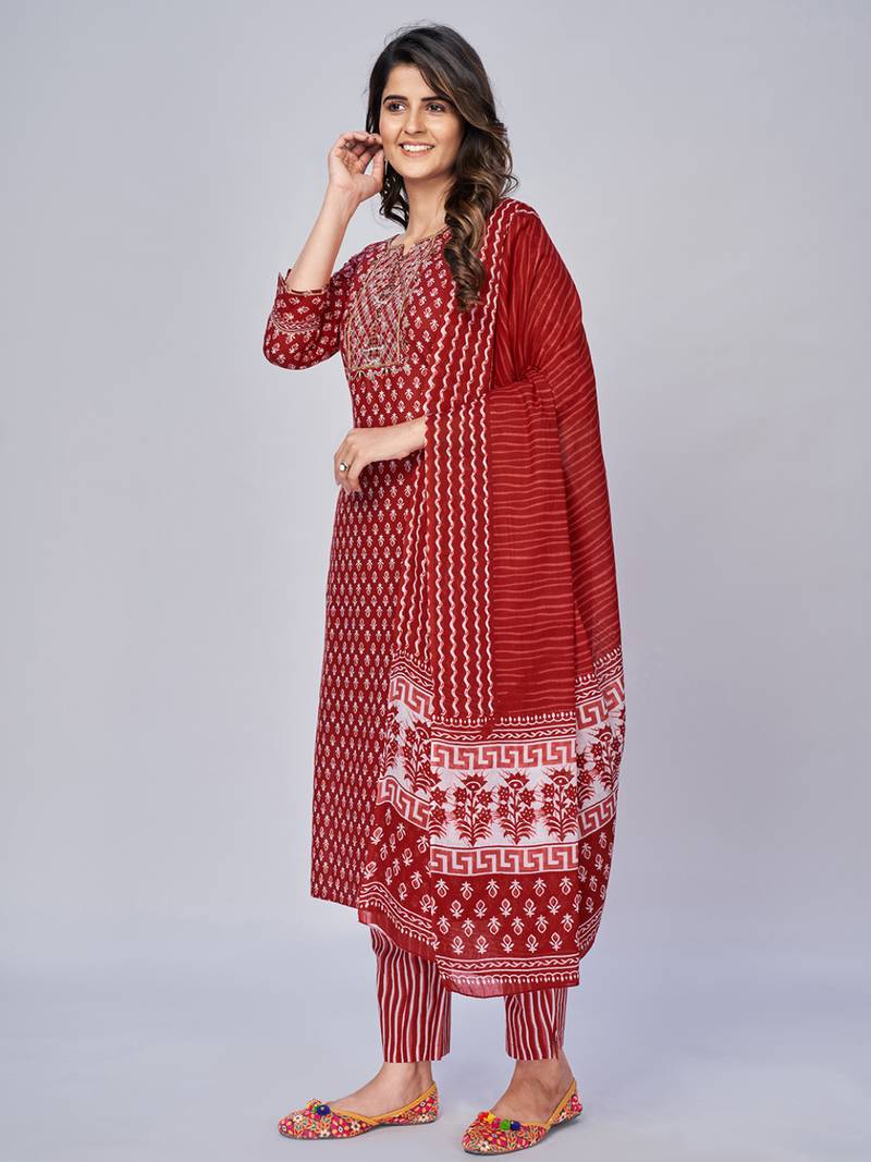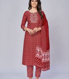 | Product Name | Women's Printed & Embroidered Straight Cotton Red Kurta With Pant & Dupatta | |