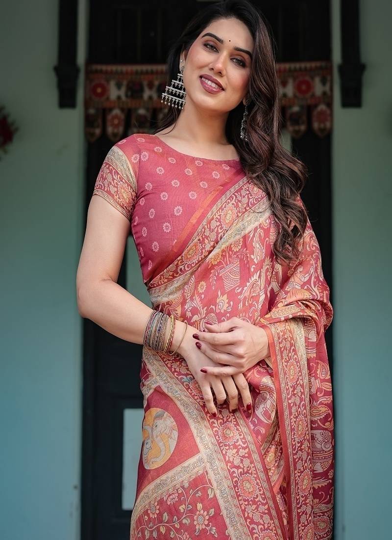 | Product Name | Brick Red Handloom Cotton Linen Saree With Mythological Motifs And Floral Border | |