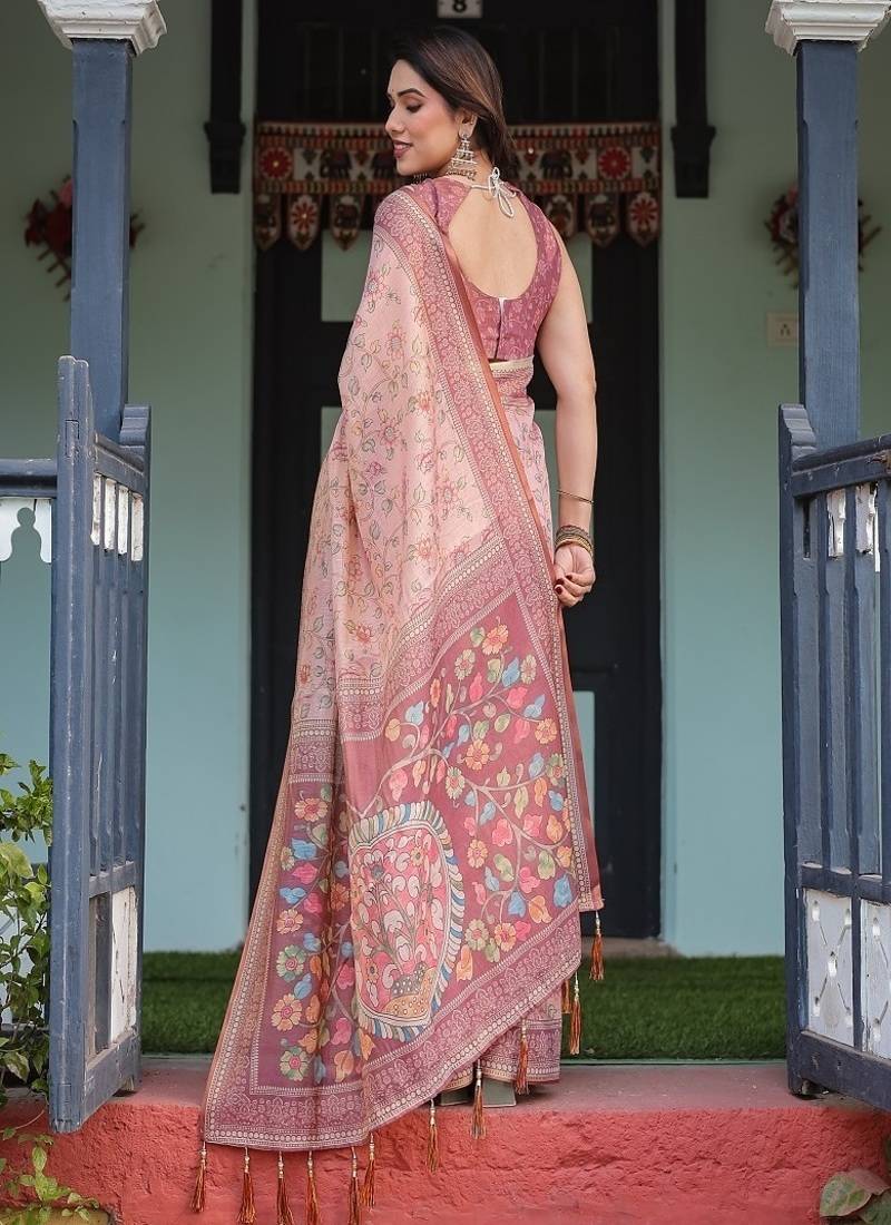 | Product Name | Dusty Pink Handloom Cotton Linen Saree With Floral Motifs And Artistic Pallu | |