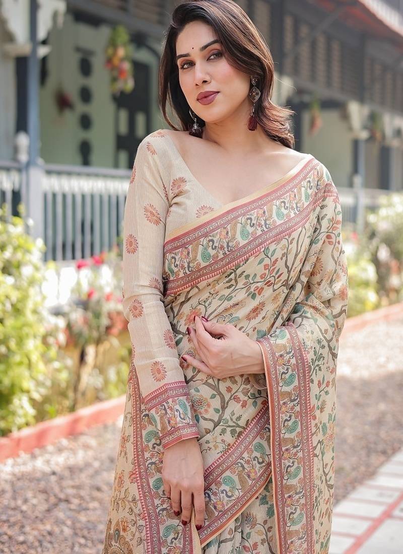 Ivory handloom cotton-linen saree with floral and peacock motifs, zari highlights, and tassel finish