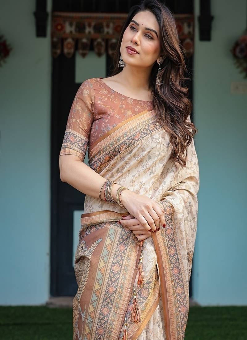 Ivory handloom cotton-linen saree with floral and peacock motifs, zari highlights, and tassel finish