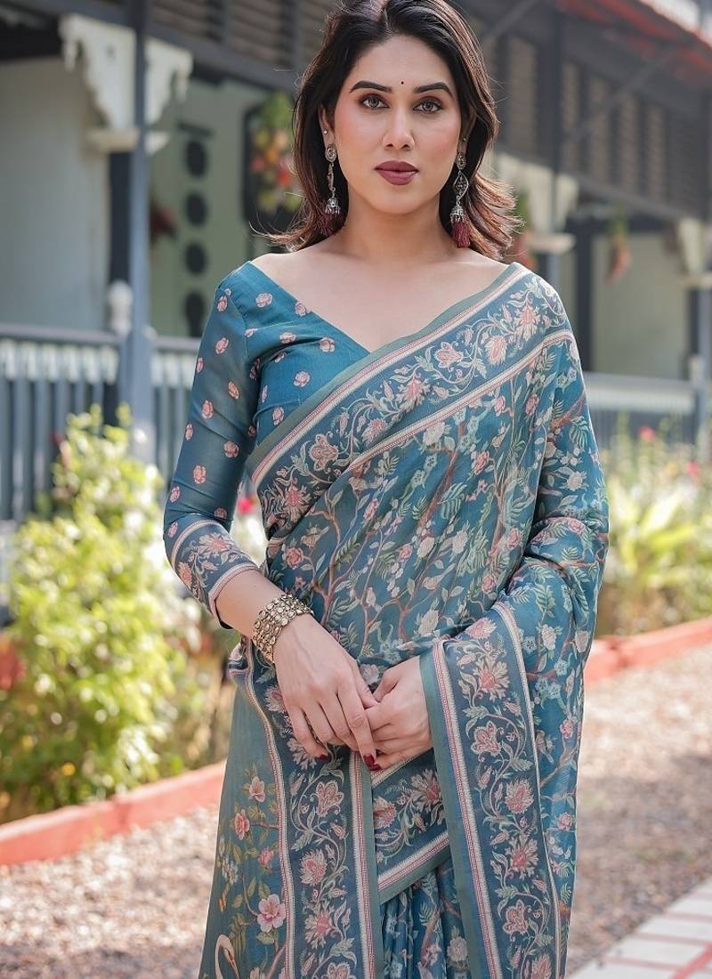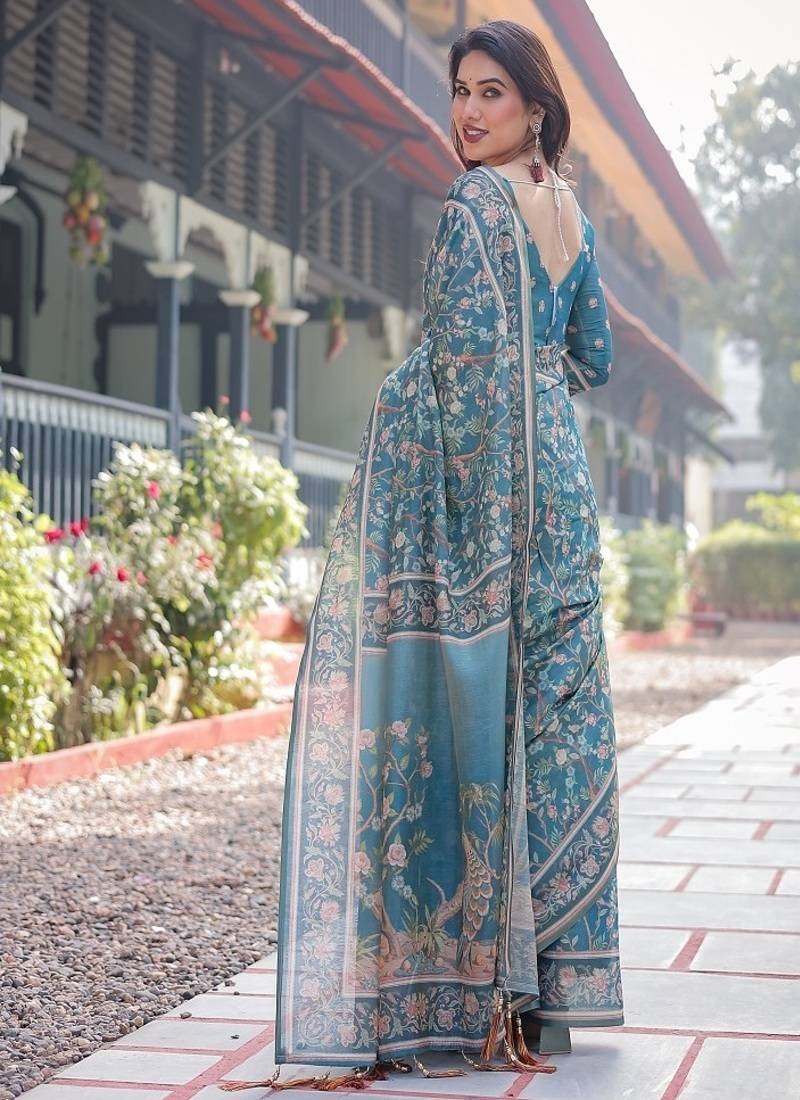 | Product Name | Pure Handloom Teal Blue Saree With Multicolor Floral Vine Print & Tassel Pallu | |