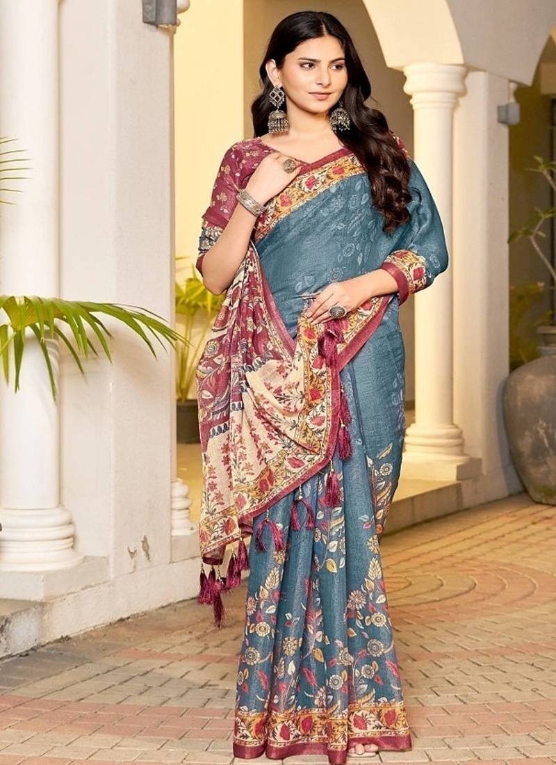 | Product Name | Teal Blue Handloom Floral Saree With Maroon Border & Tassel Pallu | |