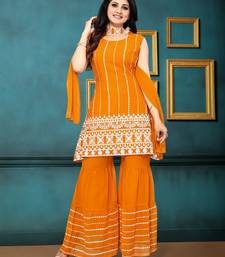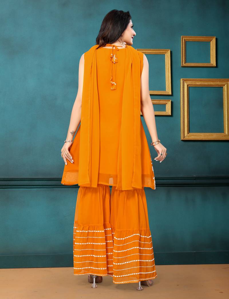 Mustard color georgette embroidered stitched kurta, sharara & dupatta set