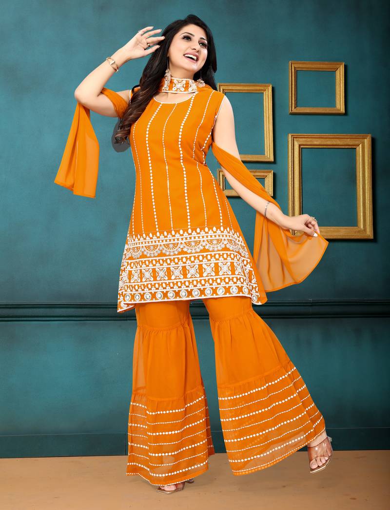 | Product Name | Mustard Color Georgette Embroidered Stitched Kurta, Sharara & Dupatta Set | |