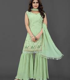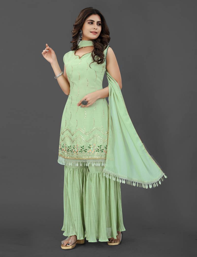 Pista color georgette embroidered stitched kurta, sharara & dupatta set