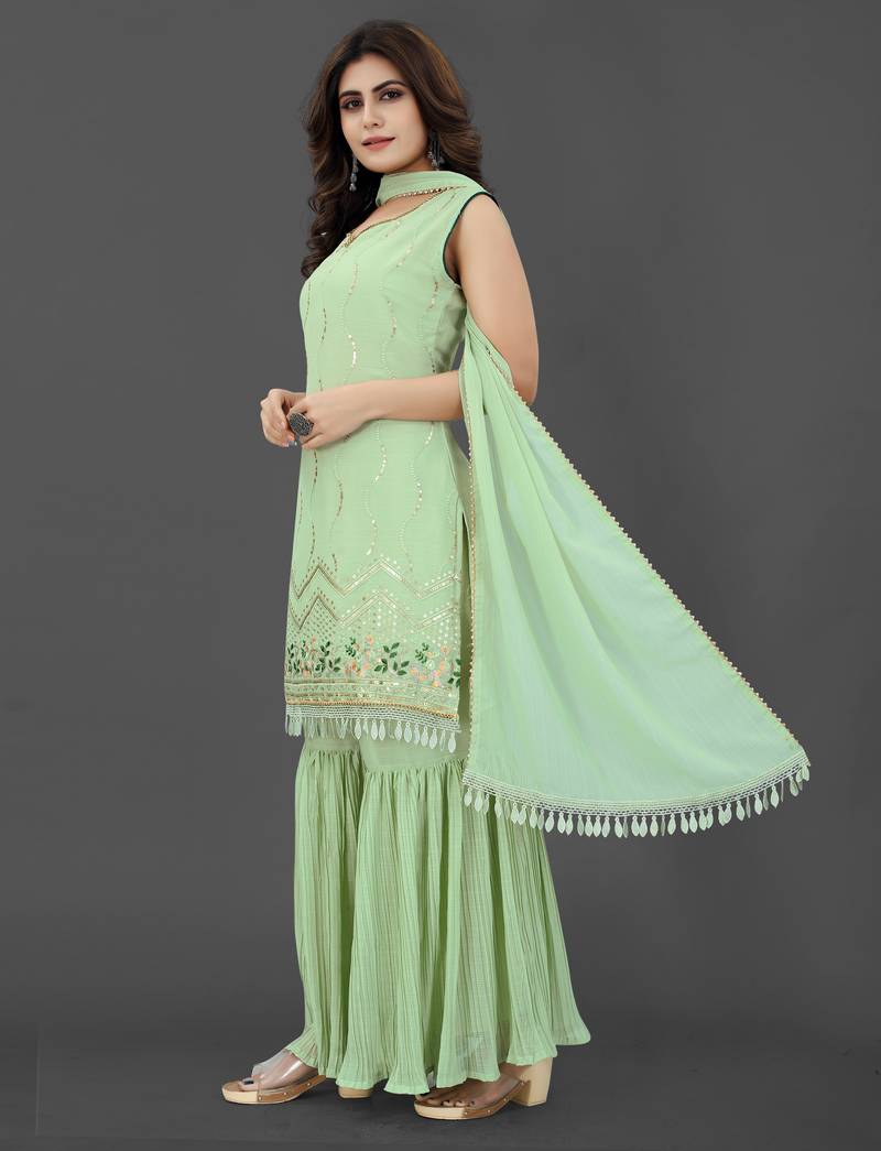 | Product Name | Pista Color Georgette Embroidered Stitched Kurta, Sharara & Dupatta Set | |