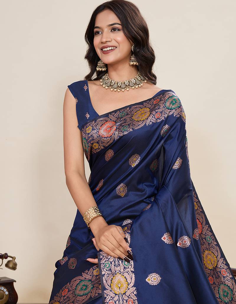 Soft litchi art silk banarasi art silk jacquard saree (amshuka-navy)