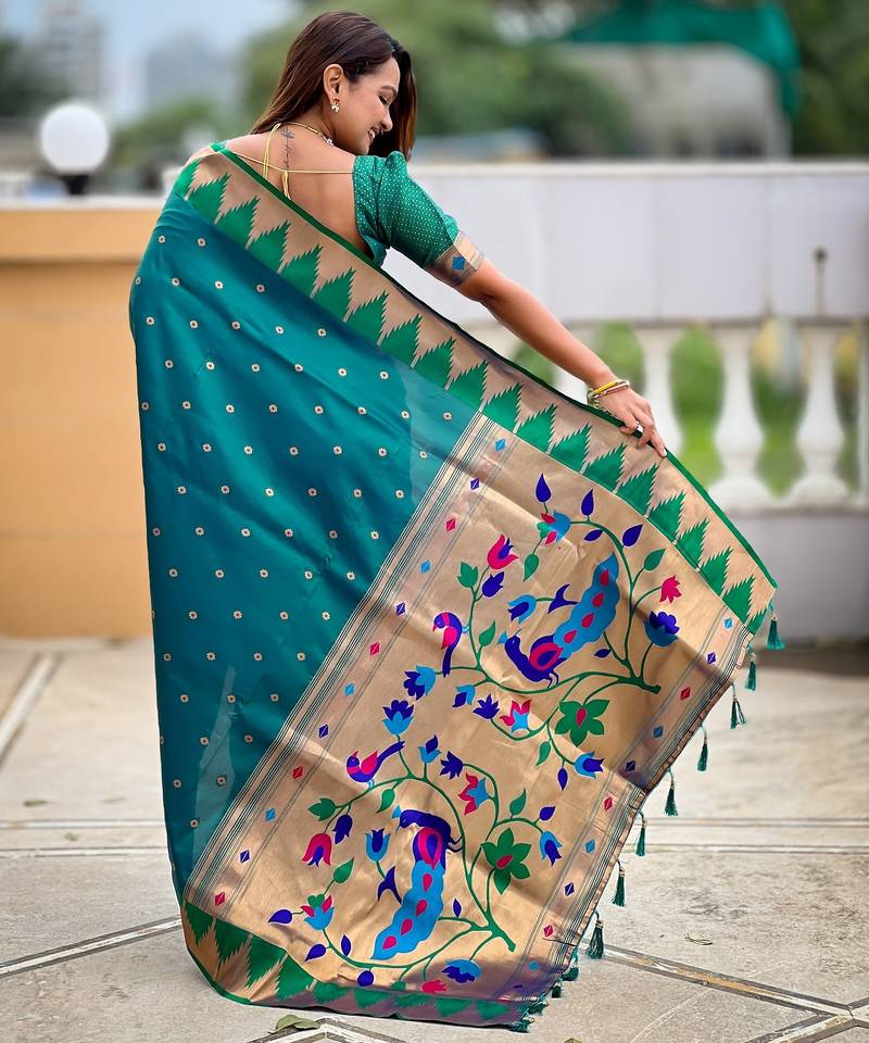 | Product Description | We Offers Paithani Softy Silk Saree With Rich Intricate Meenakari Golden Zari Jacquard Work At All Over Body, Border & Grand Pallu. Blouse, Border And Pallu Have Very Fine Same Color Matching With Saree Body. Saree & Blouse Material Is Litchi Silk Which Very Soft And Skin Friendly Material. Saree Has Beautiful Zalar (Tessel) Work At Pallu. This Saree Has A Length 6.30 Meter Which Includes 0.8 Meters Of The Blouse. These New Bollywood Designer Fashionable Saree For Women Can Be Used As Party Wear Saree, Festival Saree, Wedding Saree On Every Occasions. Product Colour May Slightly Very Due To Photographic Lighting Sources Or Your Monitor Settings. |