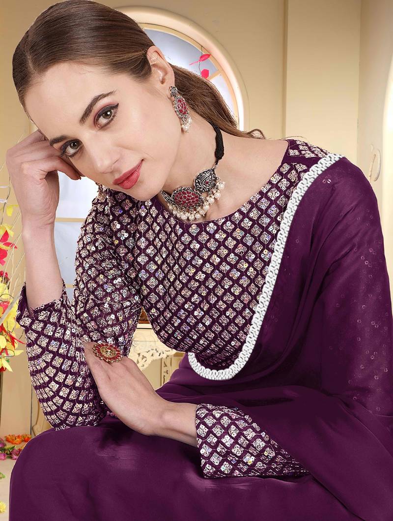 Vedant Vastram Offers Georgette Saree With Beautiful Lace Work At Border. Designer Saree Have Beautiful Heavy Sequnce Work Blouse. Material Of This Saree Is Georgette Which Is Softer And Skin Friendly. Material Of Blouse Is Banglori Silk. Color Of Sequnis Is Silver But Blouse Color Comes With Matching Color With Saree. Size Of Saree Is 6.3 M Including Blouse. These New Traditional Saree For Women Can Be Used As Party Wear Saree, Festival Saree & Wedding Saree Also. Product Colour May Slightly Vary Due To Photographic Lighting Sources Or Your Monitor Settings.