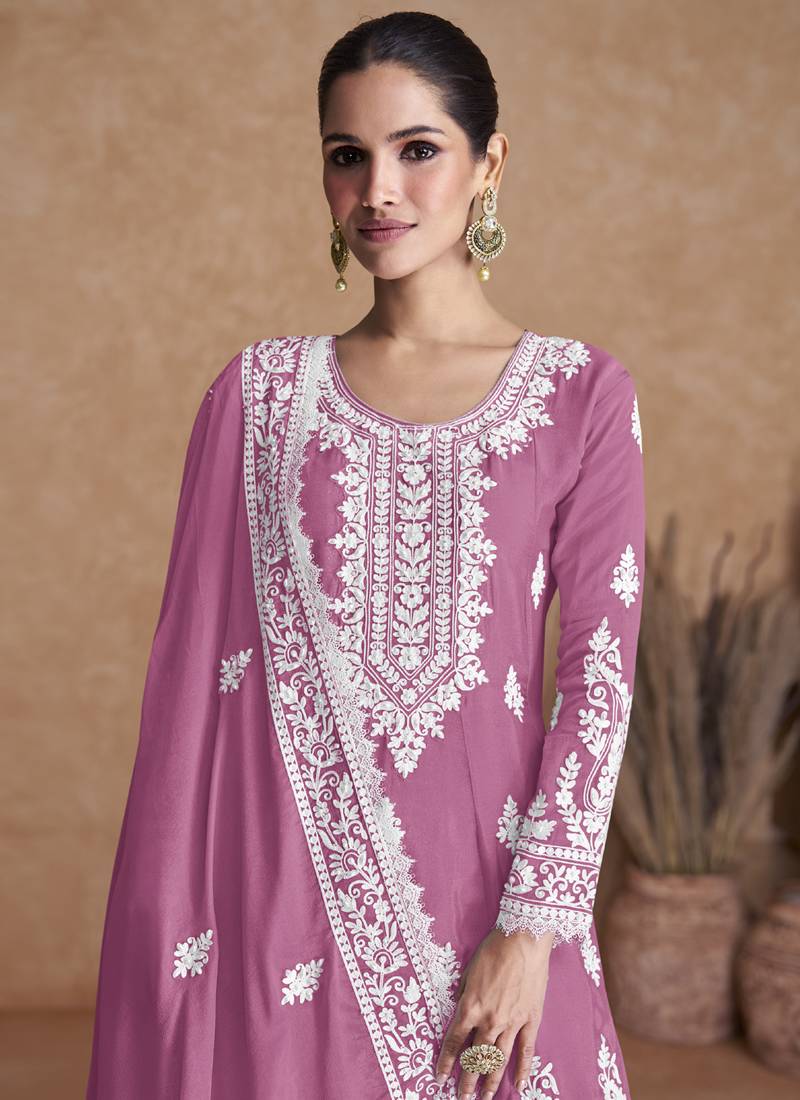 Pink chinon embroidery designer sharara suit semi stitched