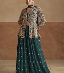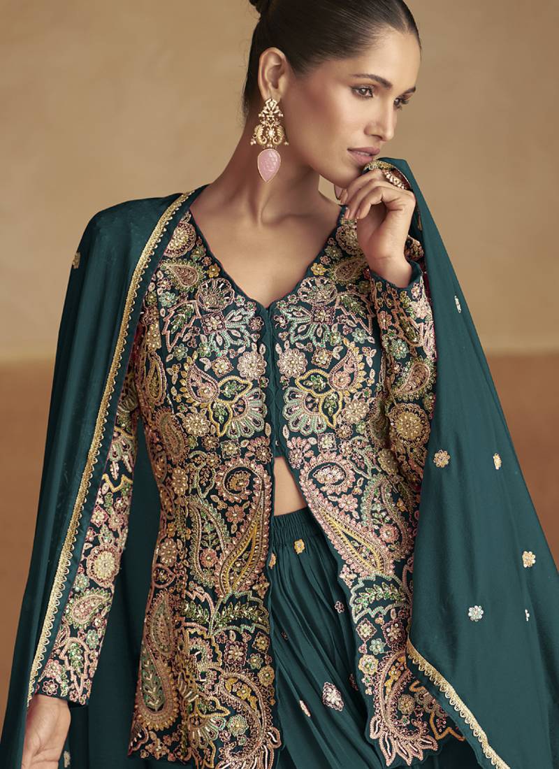 | Product Name | Aqua Green Pink Chinon Silk Embroidered Designer Plazzo Suit | |