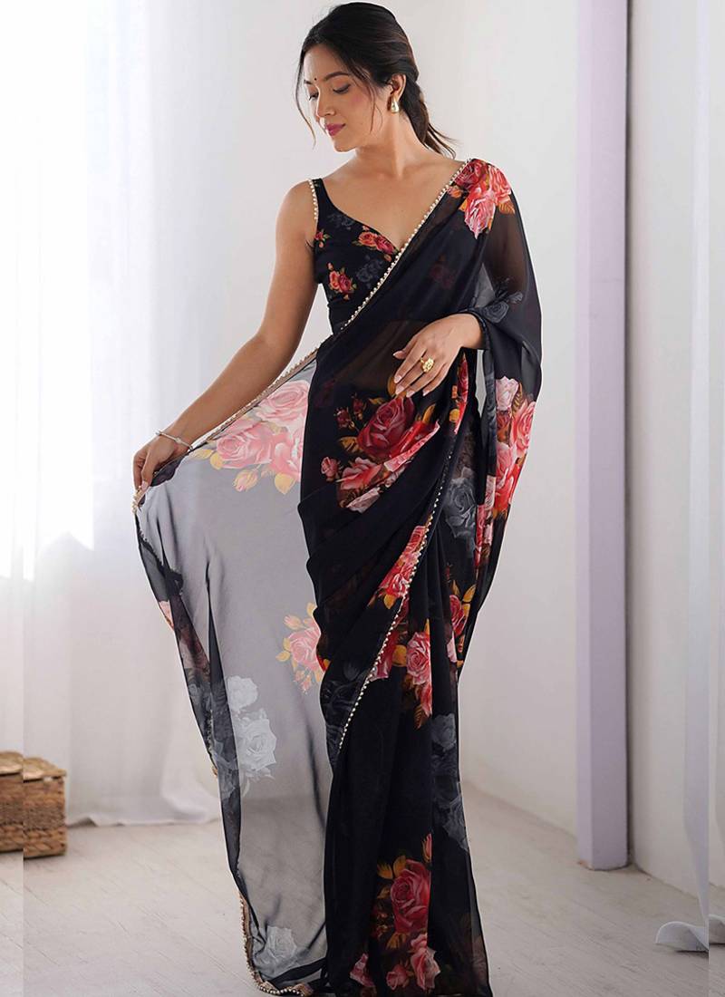 | Product Name | Black Georgette Silk Blend Printed Moti Work Border Designer Saree | |