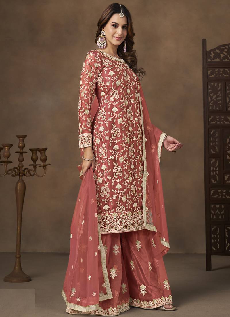 | Product Name | Dark Peach Net Embroidered Palazzo Suit | |