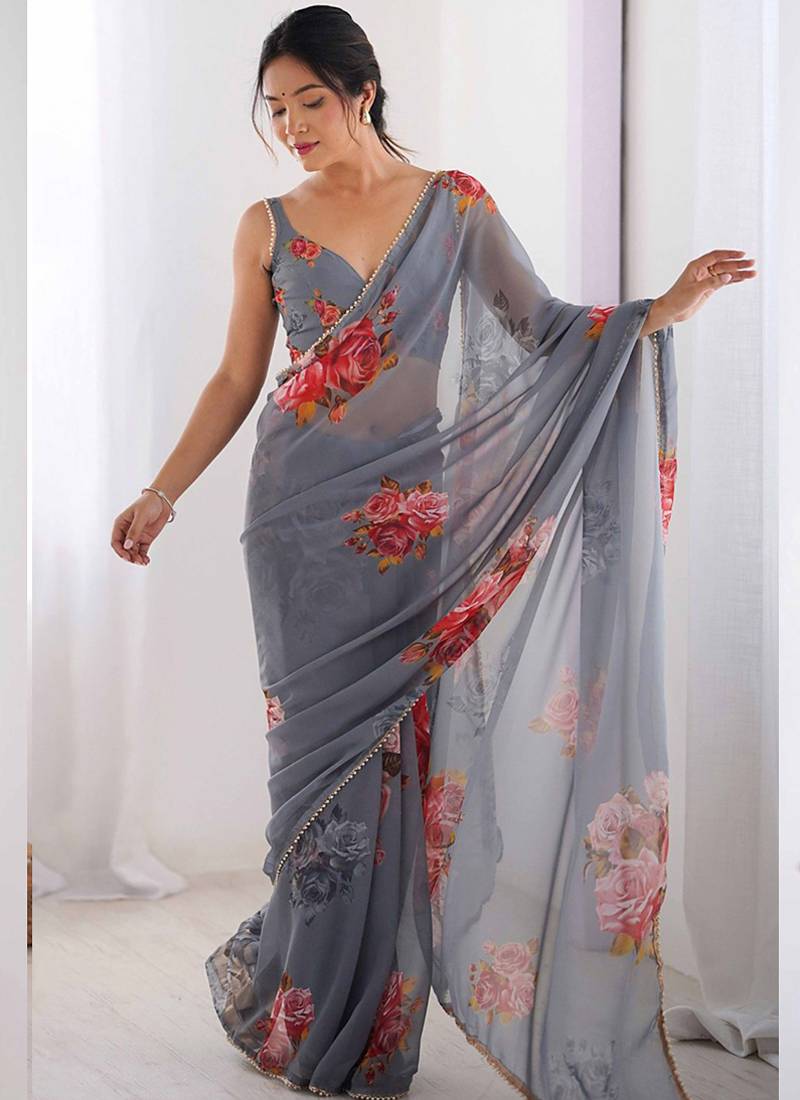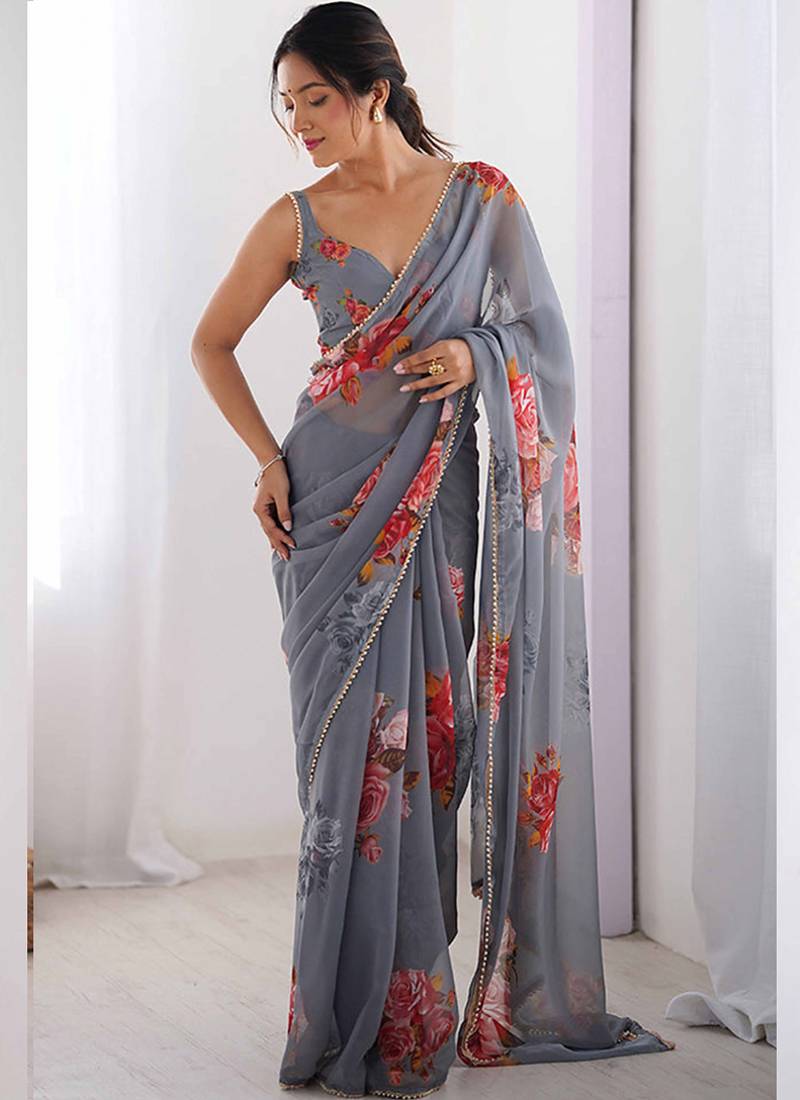 | Product Name | Grey Georgette Silk Blend Printed Moti Work Border Designer Saree | |
