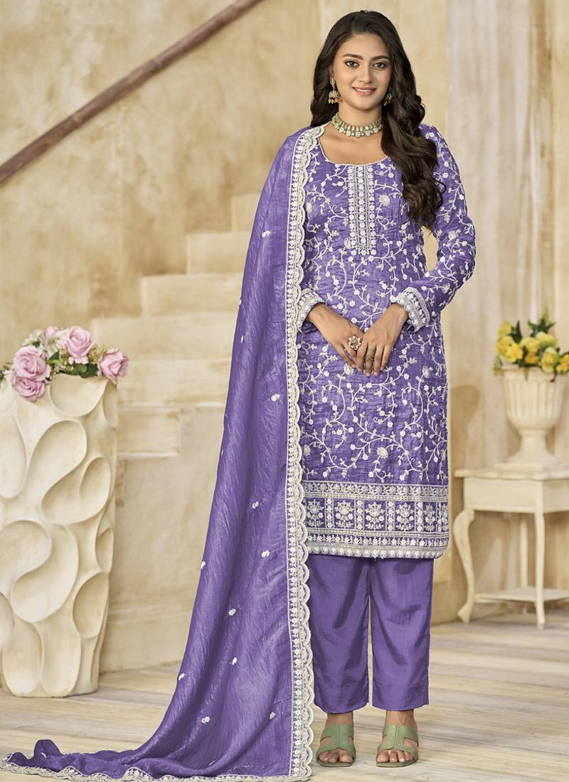 Lavender organza embroidered salwar suit for festival semi stitched