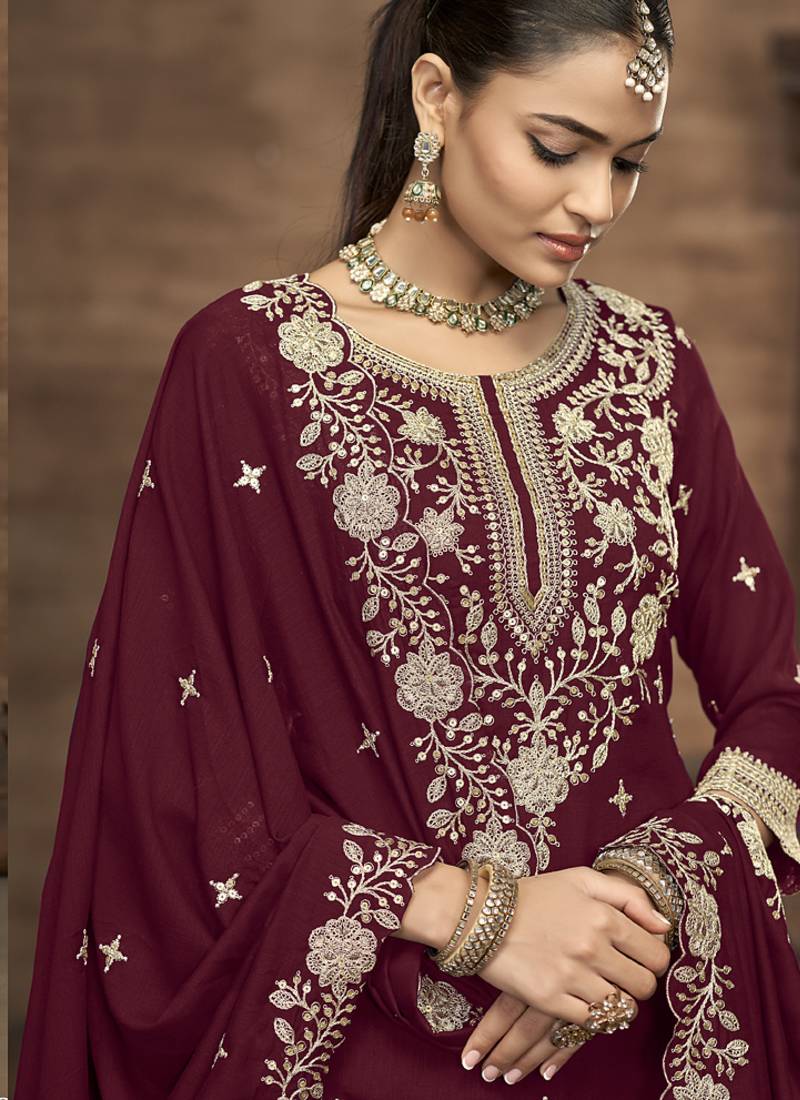 Maroon vichitra silk embroidered lehenga style suit stitched
