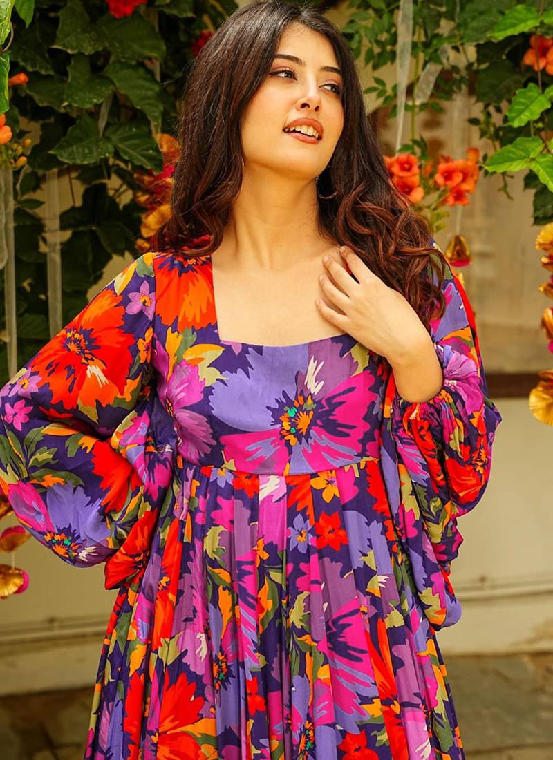 Multi color georgette digital print designer gown for festive stitched