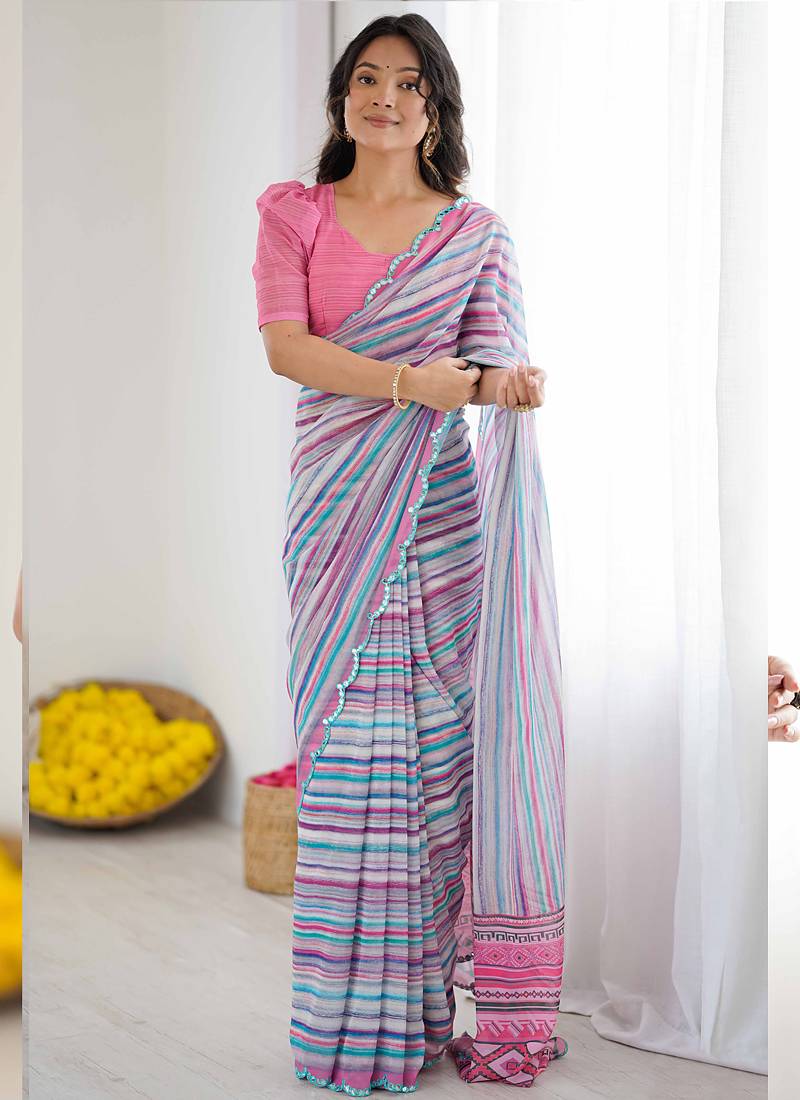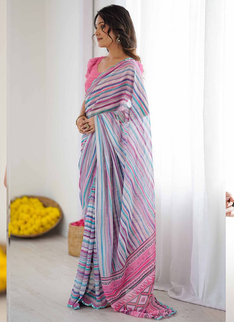 Multi color georgette printed mirror work border designer saree
