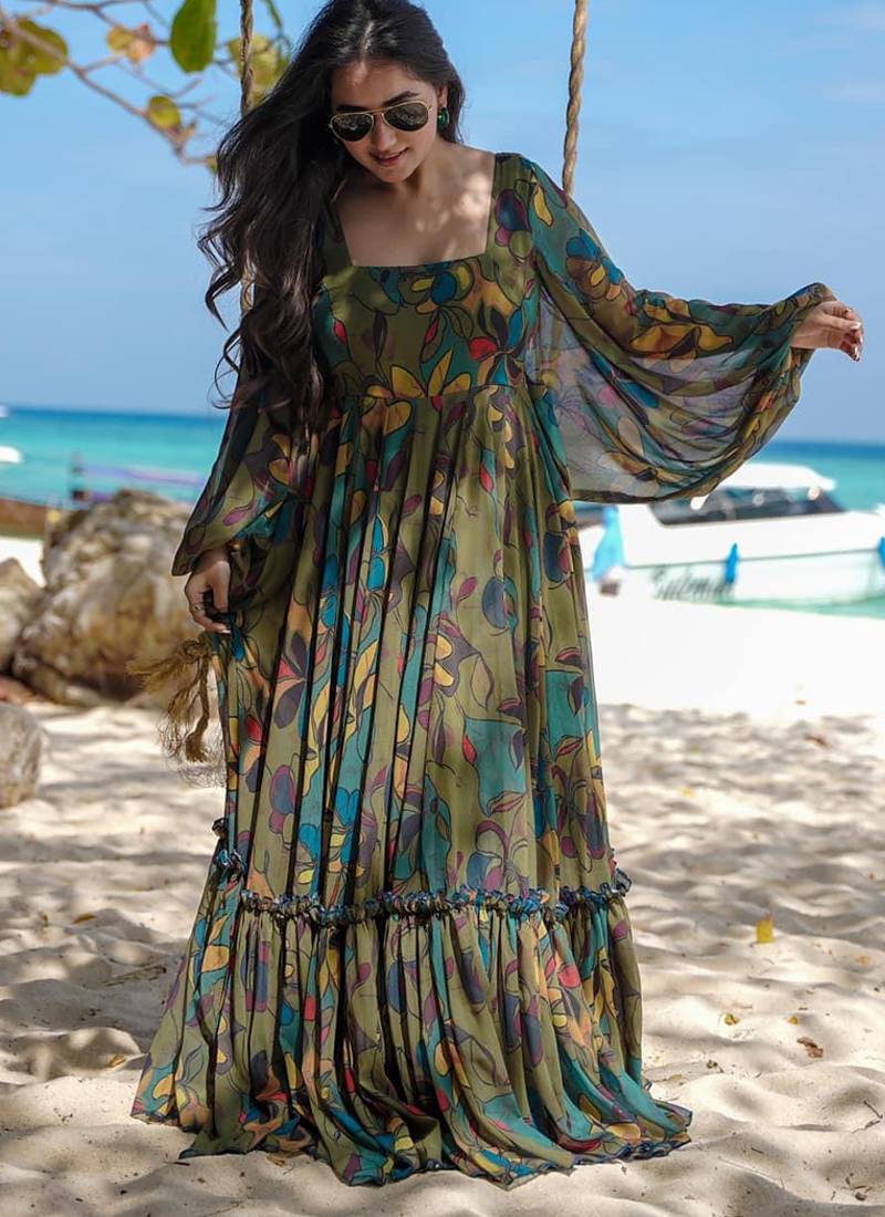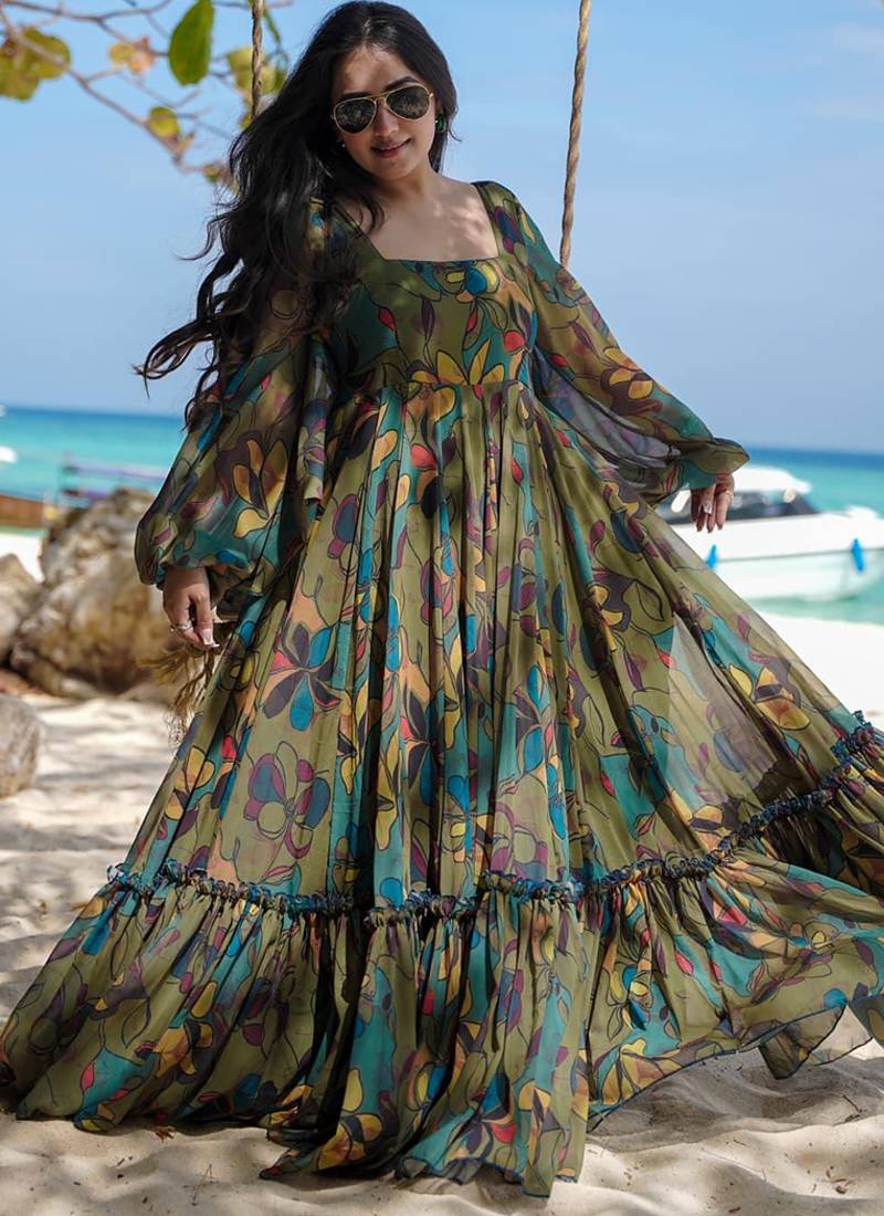 Multi color heavy air tex chinon silk digital print designer gown stitched