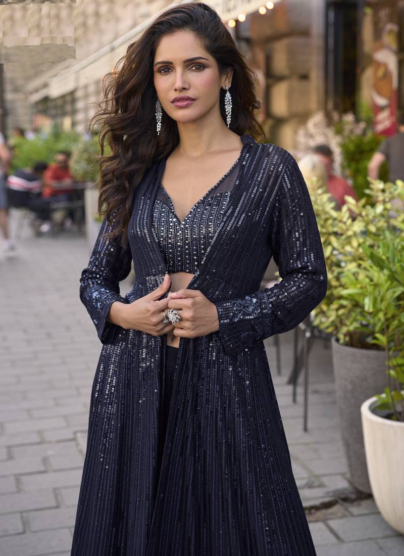 | Product Name | Navy Blue Georgette Embroidered Western Style Plazzo Suit | |