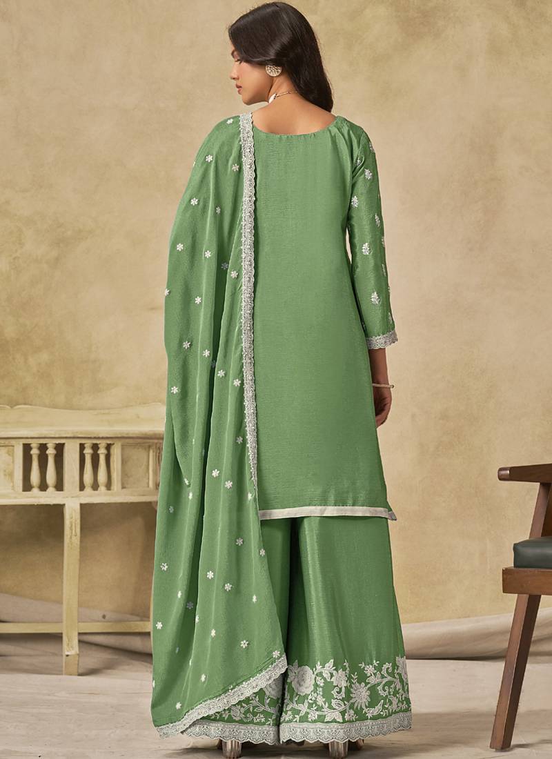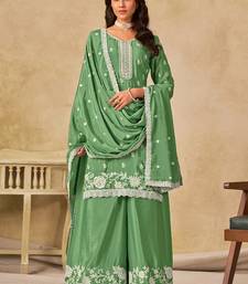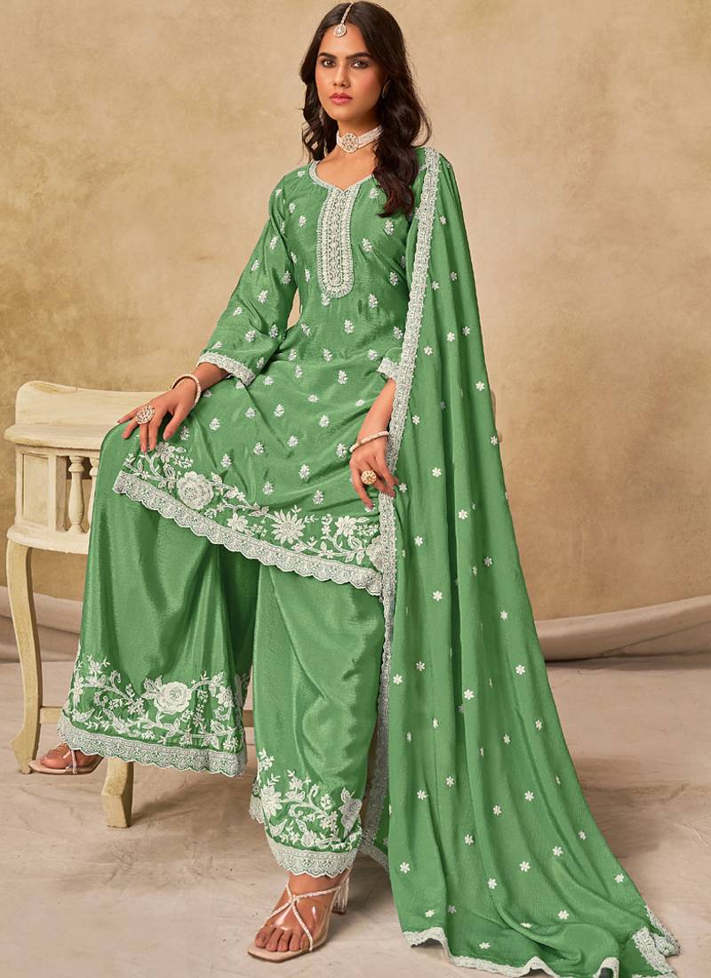 Parrot green chinon silk embroidered designer plazzo suit semi stitched