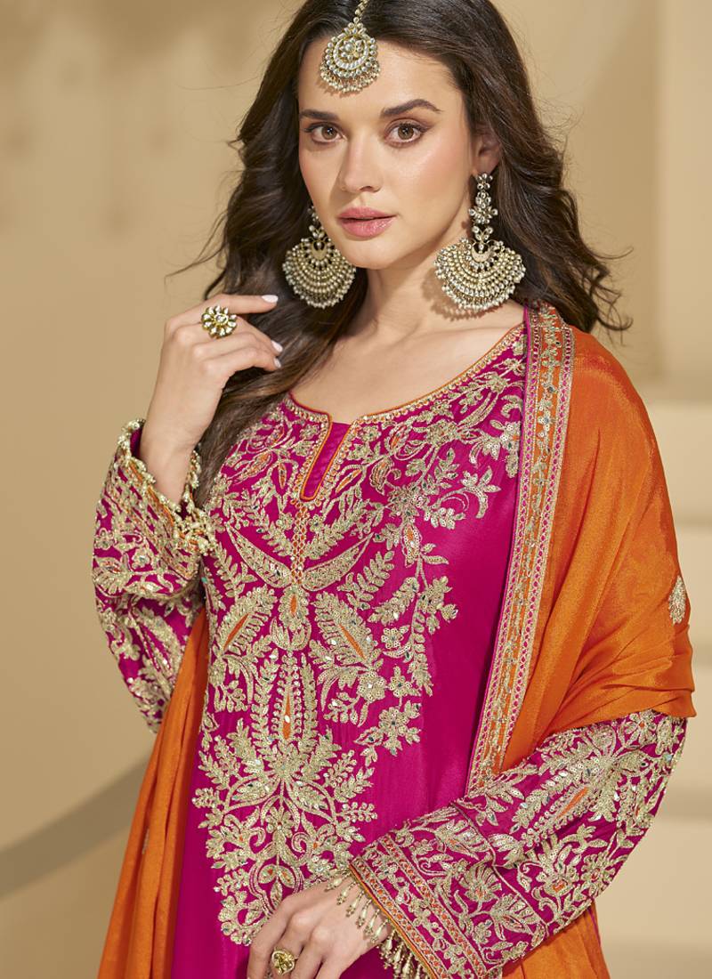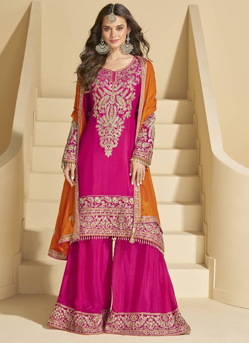 Pink chinon silk embroidered plazzo suit stitched