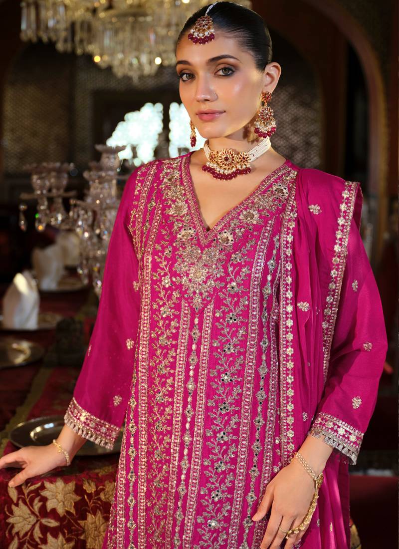 Pink chinon silk embroidered plazzo suit stitched