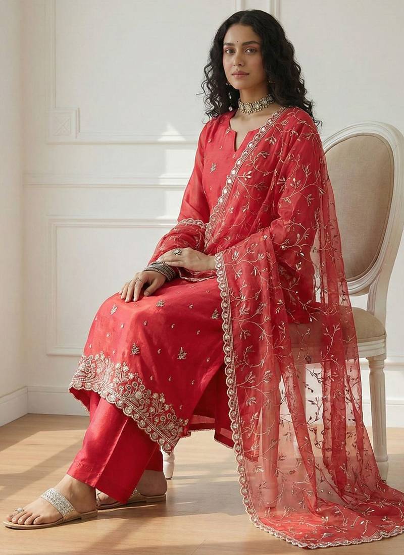 | Product Name | Red Shimmer Organza Embroidered Party Wear Suit | |