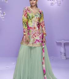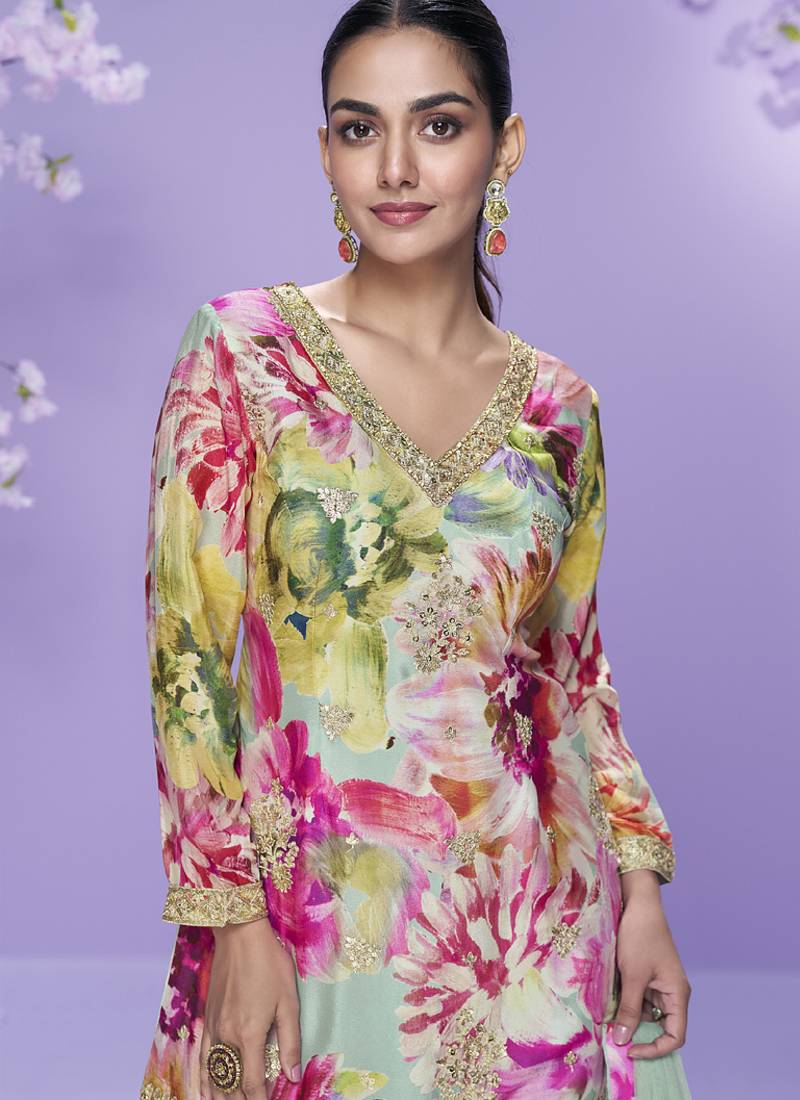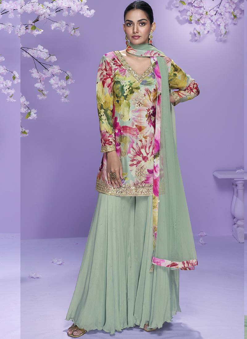 | Product Name | Sea Green Chinon Silk Digital Embridered Designer Plazzo Suit | |