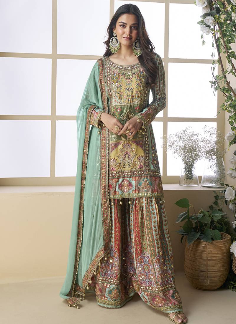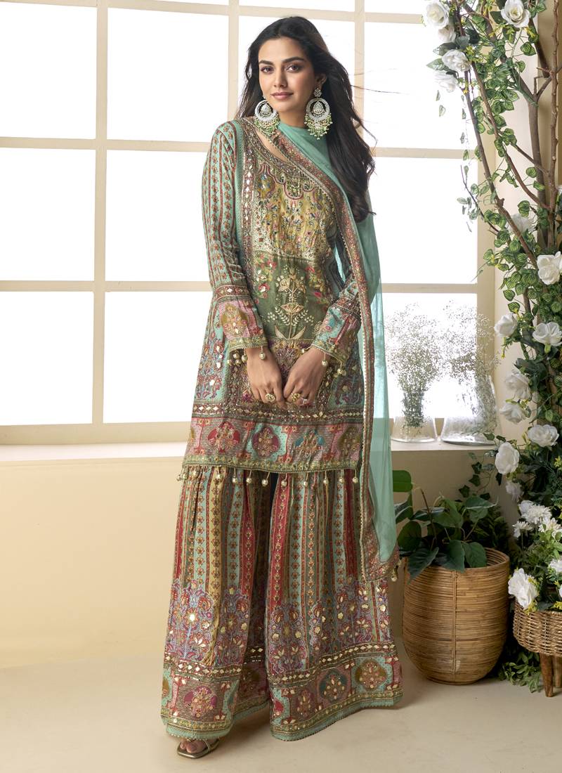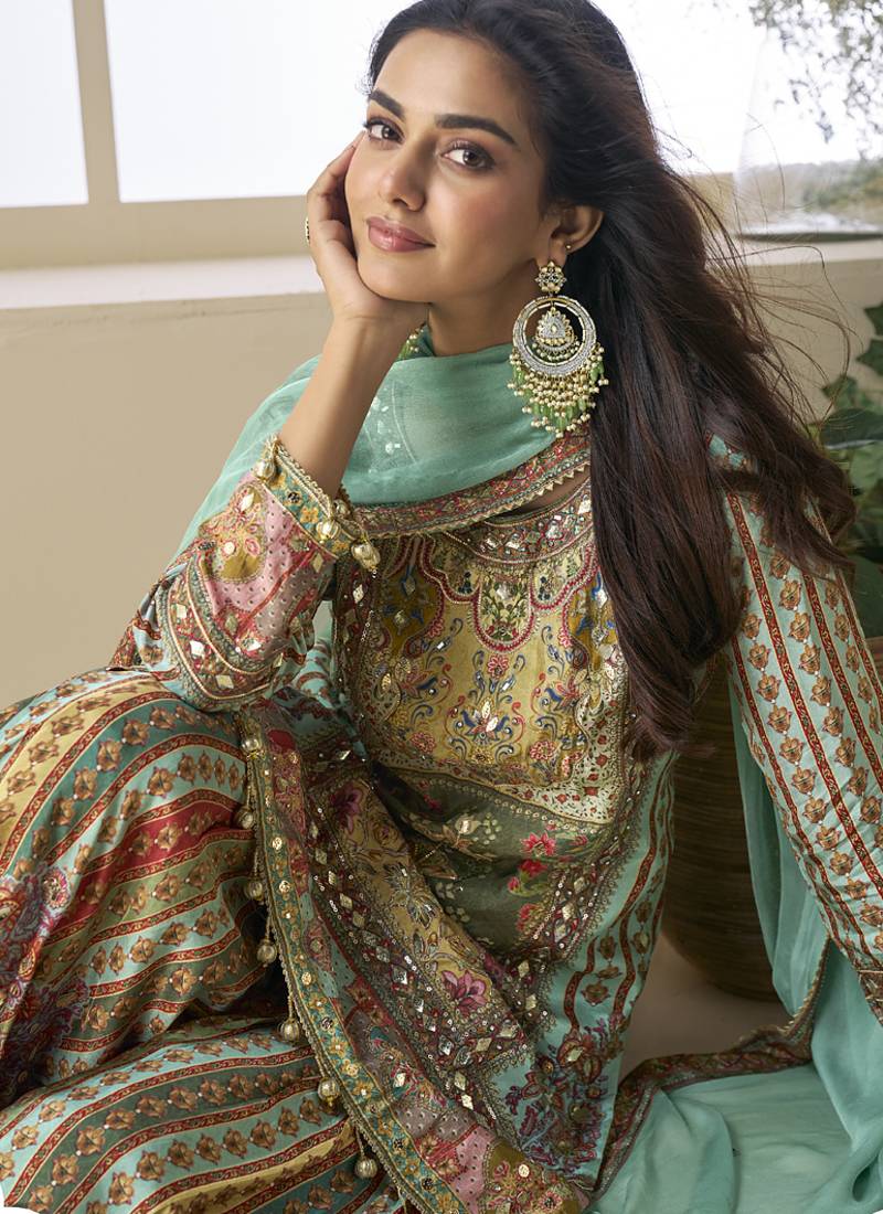 Product Name | See Green Crepe Silk Digital With Aari Work Plazzo Suit | |