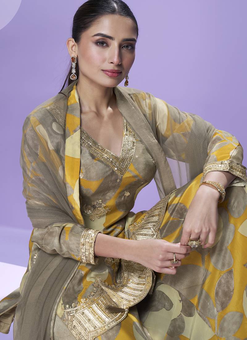 Yellow chinon silk digital embridered designer plazzo suit stitched