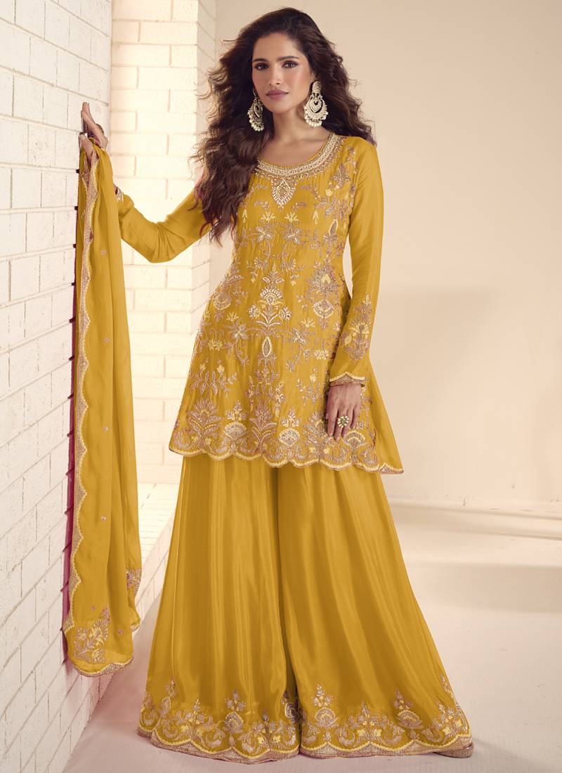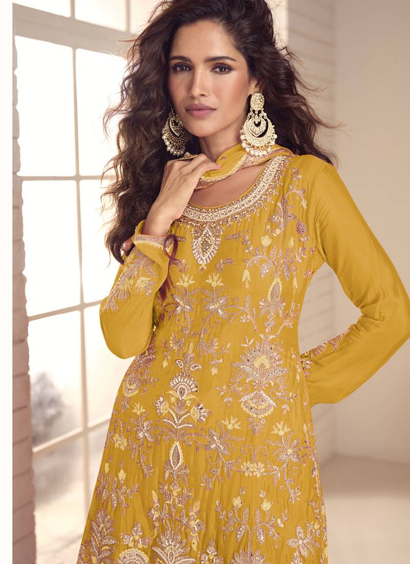 Yellow chinon silk embroidered plazzo suit stitched