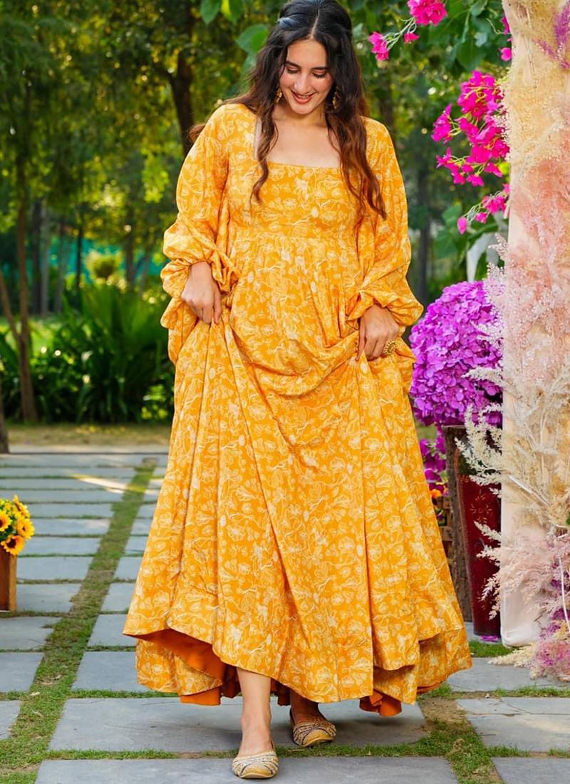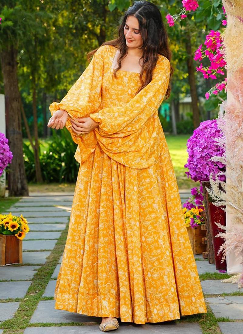 | Product Name | Yellow Georgette Digital Print Designer Gown For Festive | |