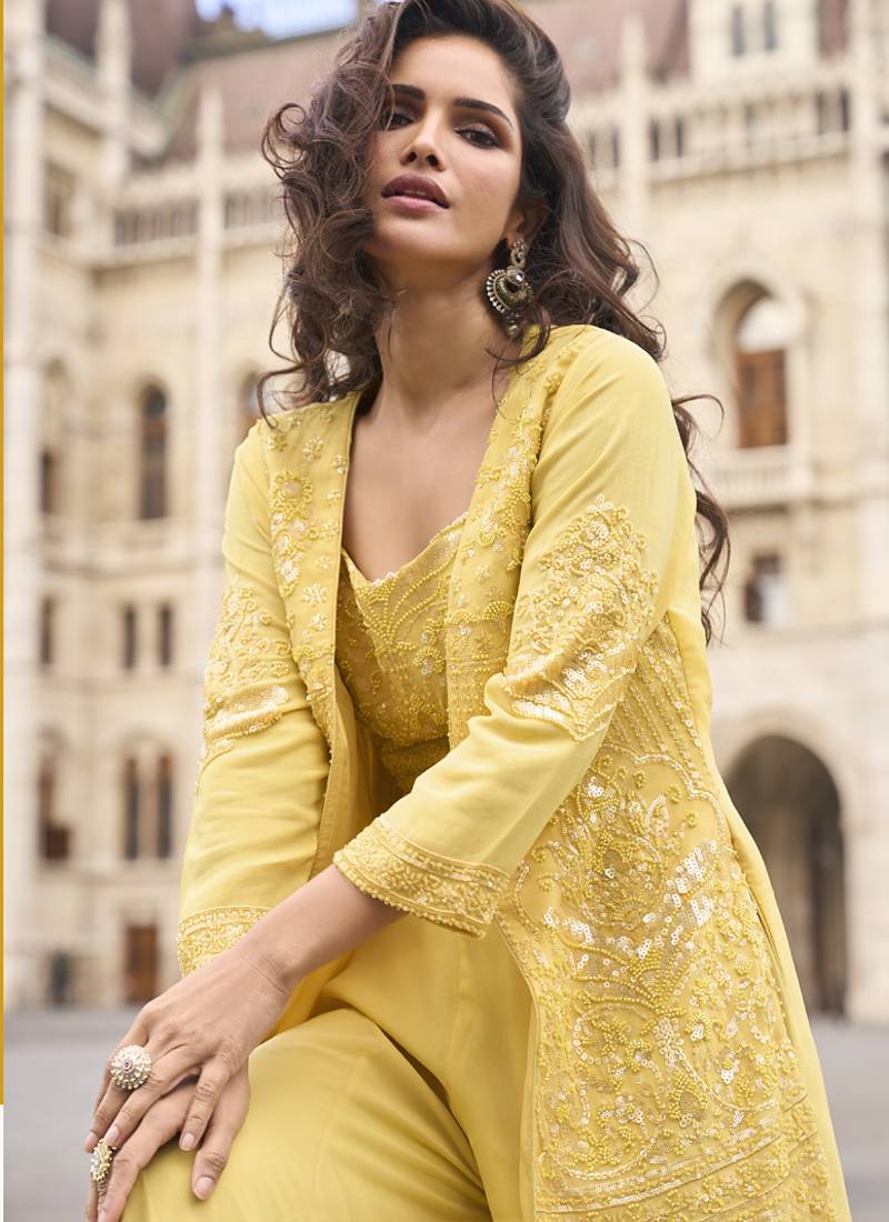 | Product Name | Yellow Georgette Embroidered Beads Work Western Plazzo Suit | |