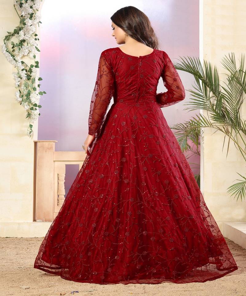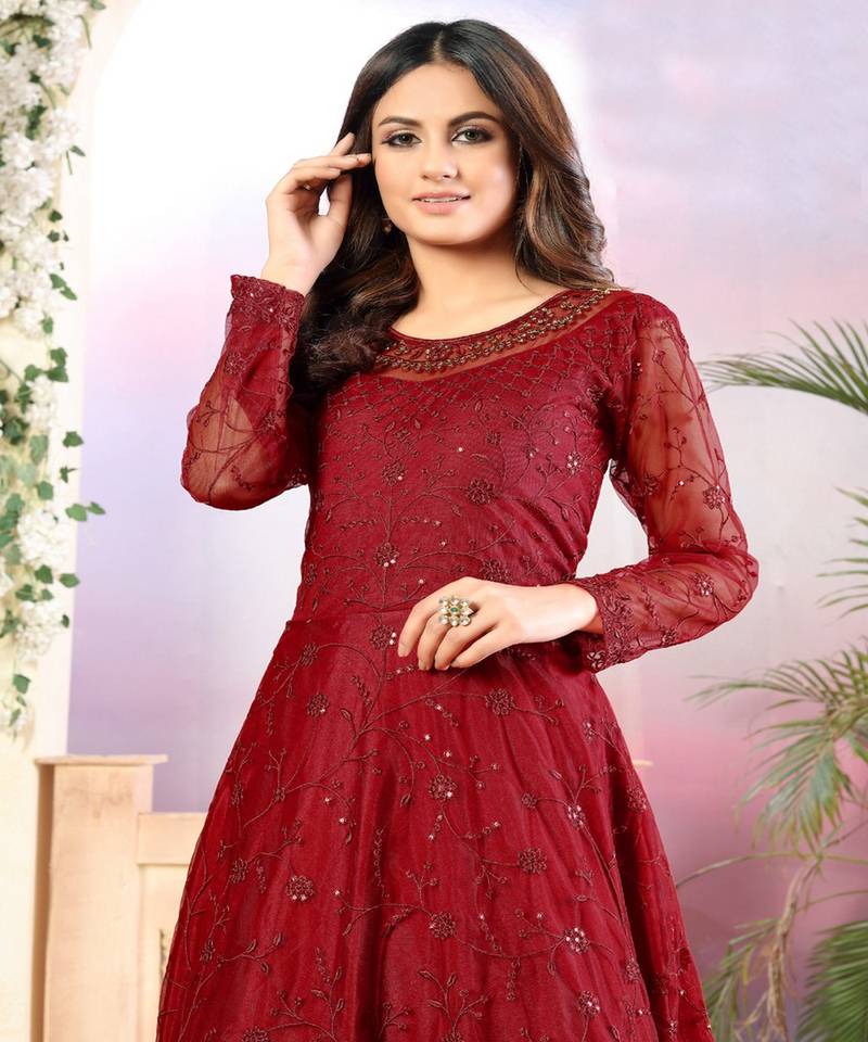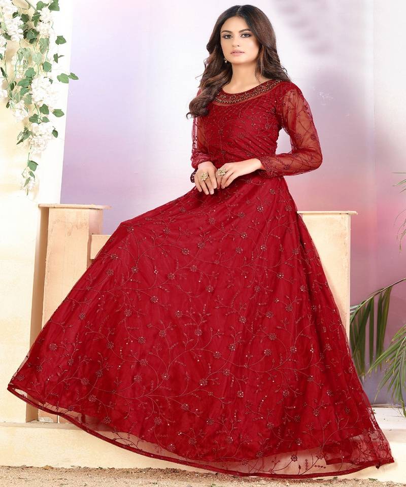 Red net anarkali salwar kameez semi stitched